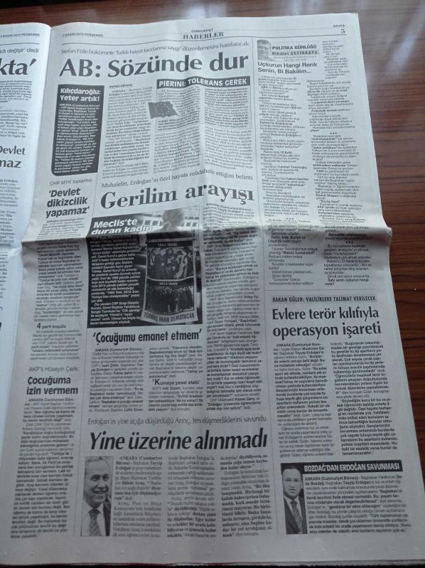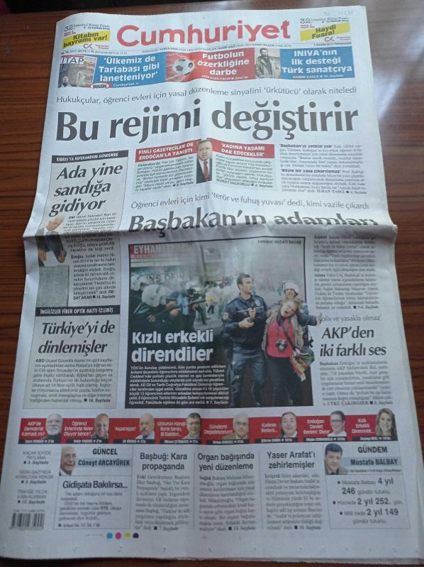Cumhuriyet Gazetesi - 7 Kasım 2013 - Özerkliğin Ruhuna El Fatiha - Mancini'nij Avrupa Vizyonu - Kıbrıs Yine Sandığa Gidiyor - INıVA'nın İlk Desteği Türk Sanatçıya - Kızlı Erkekli Direndiler - İngilizler Fiber Optik Hattı İzlemiş - Yaser Arafat'ı Zehirlemişler adlı eser Türkçe dilindedir.