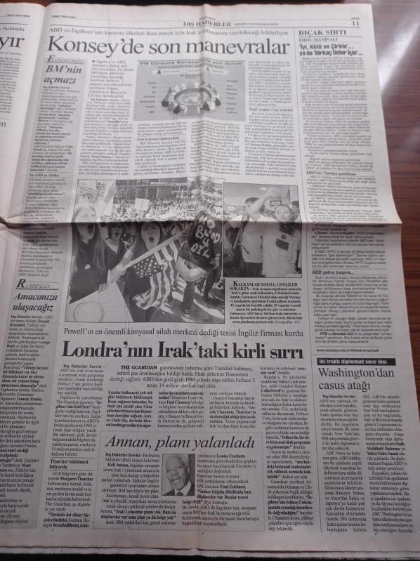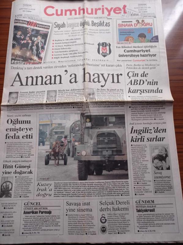 Cumhuriyet Gazetesi - 7 Mart 2003 - Ali Sami Yen Stadında Sarı Lacivert Yasak - Beşiktaş 100 Yaşında - Kofi Annan'a Hayır - İngilizden Kirli Sırlar Irak'a Tesis Kurduğu Ortaya Çıktı - Çin De ABD'nin Karşısında - Melih Gökçek Yargıyla İnatlaşıyor Hitit Güneşi Yine Doğacak - Savaşa İnat Yine Sinema adlı eser Türkçe dilindedir.