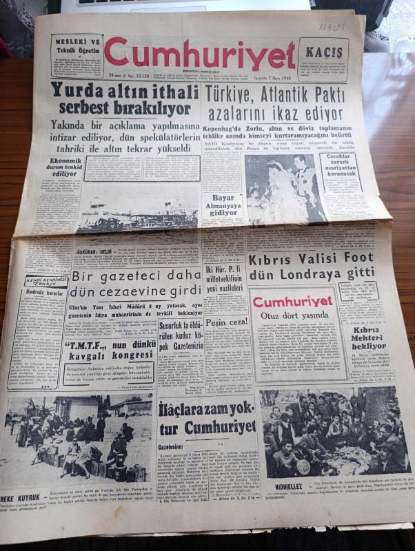 Cumhuriyet Gazetesi - 7 Mayıs 1958 - Yurda Altın İthali Serbest Bırakılıyor - Türkiye Atlantik Paktı Azalarını İkaz Ediyor - Londra'da Kıbrıs Ananesine Uygun Nikah Fotoğrafı - Üsküdar Vapuru Geldi Fotoğraf - Gazeteci Nihat Subaşı Daha Dün Cezaevine Girdi - Kıbrıs Valisi Foot Dün Londra'ya Gitti - Hıdırellez Fotoğrafı - Topkapıda Gaz Kuyruğu Fotoğraf - Tiyatrolar Ve Kahveler Yazan Ahmet Hamdi Tanpınar - Hint Filozofu Tagor İçin Anma Toplantısı - Türkiye'nin NATO'ya İkazı Yazan Ömer Sami Coşar - Üsküdar Beylerbeyi Yolunun İstimlaki - Eğlence Yerleri 24 e Kadar Açık Kalabilecek - 1958 Cannes Film Festivali Yazan Aydemir Balkan - Sanat Âleminde Georges Tzipine ve Ayşegül Sarıca - Hollanda'da Kıymetli Bir Galibiyet Alan Milli Takım Dönüyor Fotoğrafı - Juventus İtalya Lig Şampiyonu Oldu - Bangu Takımı Galatasaray İle Oynayacak - Kaderin Cilvesi Filmi Ar Sinemasında adlı eser, Kitap > Süreli Yayınlar > Gazeteler > Türkiye > Genel > Günlük kategorisinde İkinci El olarak satıştadır.