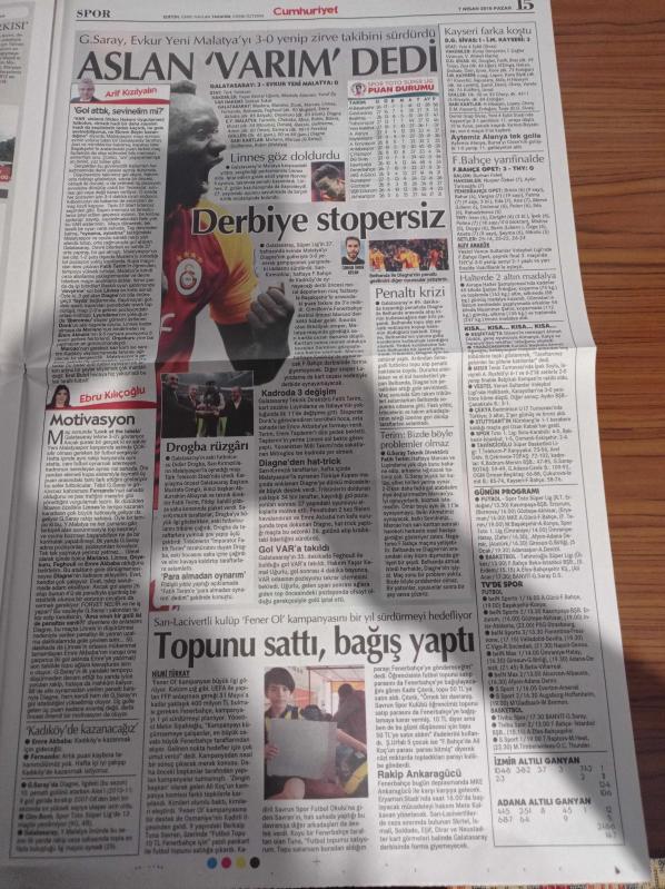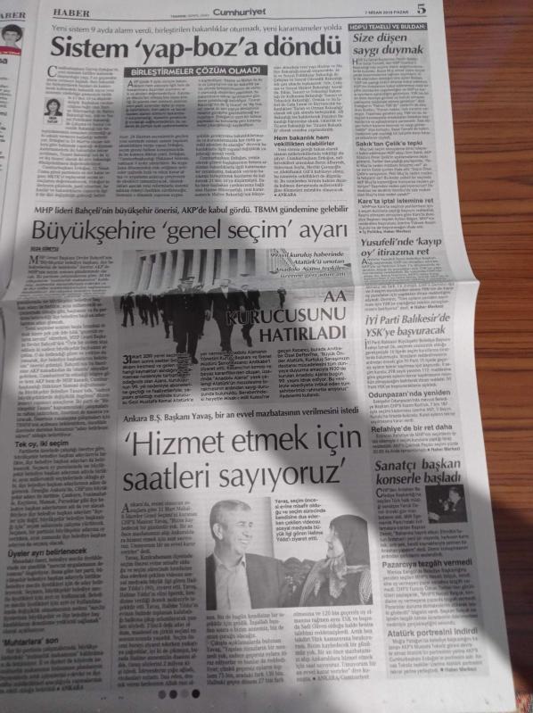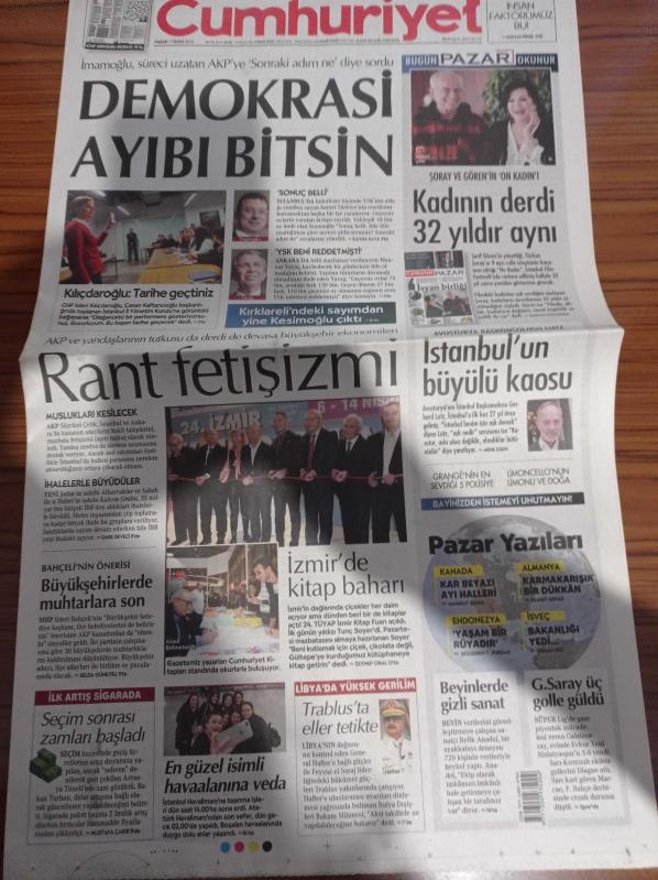 Cumhuriyet Gazetesi - 7 Nisan 2019 - Fenerbahçe Takımı Fener Ol Kampanyasını Sürdürüyor - Ekrem İmamoğlu Süreci Uzatan AKP'ye Sonraki Adım Ne Diye Sordu - Kemal Kılıçdaroğlu İstanbul İl Yönetimine Tarihe Geçtiniz - Canan Kaftancıoğlu - Mansur Yavaş - Rant Fetişizmi - Devlet Bahçeli'nin Önerisi Büyükşehirlerde Muhtarlara Son - Türkan Şoray adlı eser Türkçe dilindedir.