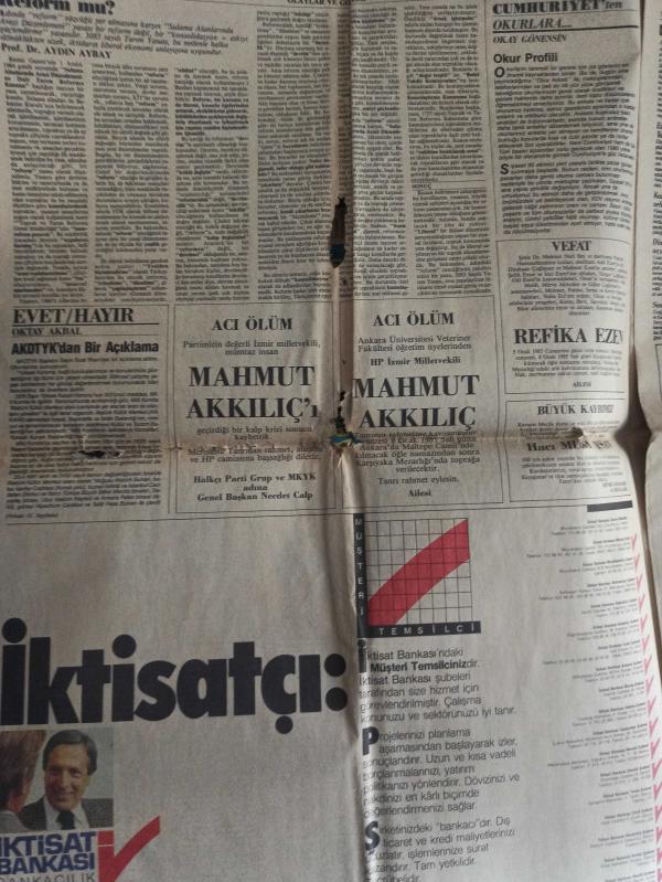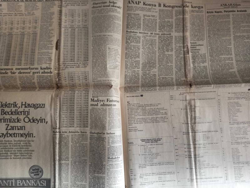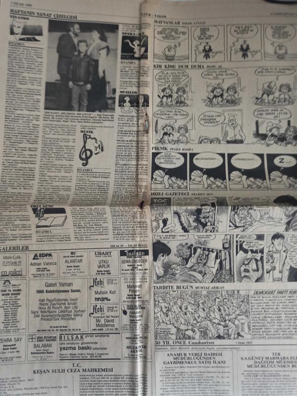 Cumhuriyet Gazetesi - 7 Ocak 1985 - Özdağlar için 'rüşvet' iddiası - Turgut Özal - 1985'te emekli olacak memurların ikramiyeleri - Kıbrıs için Atina'da hava iyimser - Reform mu? - Tarihi buluşma bugün - Cenevre Öncesi Washington - Soluklu resim için yalnız sağlıklı dünya görüşü yetmez - Haftanın Sanat Çizelgesi - Hayvanlar, Kim Kime Dum Duma, Piknik ,Hızlı Gazeteci, Tarihte Bugün Çizgi Romanı - Alışverişte belge düzeni nasıl olacak? - ANAP Konya İl Kongresi'nde kavga - Krizin kapısı, perşembe aralandı - Keban senetleri bugün satışta - Osman Ulagay - Vatandaşı Kandırmak - İstihsal Vergisi'nden kurtulan mallarda ucuzluktan eser yok - BWM Araba Reklamı - Eczacıbaşı 13'ü buldu - Galatasaray sigortalandı - Milyarlık takım düş kırıklığı yarattı - Ekonomi Notları - Keban Barajı'nın Gelir Ortaklığı Senetleri tüm İş Bankası şubelerinde bugün satışa sunulmuştur - Adolfo Suarez - Santiago Carillo - Darbeciler karşısında utanç verici bir duruma düşemezdim - Tam Takım Gazete Yıpranma, sararmalar, kupon kesiği ve yırtılmalar zamana bağlı olarak görülebilir