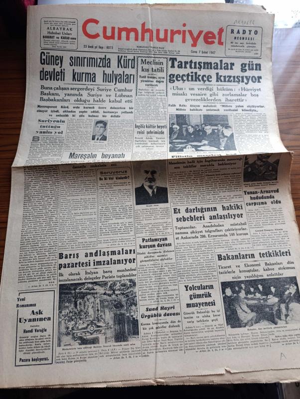 Cumhuriyet Gazetesi - 7 Şubat 1947 - Suriye'nin tuttuğu yanlış yol Cumhuriyet Başmakale - Güney sınırımızda Kürt devleti kurma hülyaları - Kürtlerin şefi ve önderi olduğu söylenen Sabri Buzan fotoğraf - meclisin kış tatili - Ulus gazetesinin verdiği hüküm - Falih Rıfkı Atay'ın makalesi millete yalan söylüyorlar - Filistin konferansı'nda Bevin diğer murahhaslarla bir arada fotoğraf - Yunan Arnavut hududunda çarpışma oldu - Ticaret Bakanı Atıf inan ve ekonomi bakanı Tahsin Bekir Balta Dün tüccarlarla görüşürlerken fotoğraf - Mareşal Fevzi Çakmak'ın beyanatı - Suat Hayri Ürgüplü davası - barış antlaşmaları pazartesi imzalanıyor - Türk güreşi Yazan İsmail Habib Sevük - eski İstanbul yaşayışı yazan Adile Ayda - Ürdün kralı Abdullah ile bir mülakat - hep istiyorlar yazan Burhan Felek - kanserle Savaş Kurumu kuruluyor - Rusya Amerika'dan ödünç aldığı 95 gemiyi iade etmiyor - eşsiz Türk filmi yanık kaval senaryo ve reji Baha Gelenbevi - Yunus Nadi mükafatı Almanya meselesi - radyo programı, Yunus Nadi tarafından kaleme alınmıştır. Cumhuriyet Gazetesi - 7 Şubat 1947 - Suriye'nin tuttuğu yanlış yol Cumhuriyet Başmakale - Güney sınırımızda Kürt devleti kurma hülyaları - Kürtlerin şefi ve önderi olduğu söylenen Sabri Buzan fotoğraf - meclisin kış tatili - Ulus gazetesinin verdiği hüküm - Falih Rıfkı Atay'ın makalesi millete yalan söylüyorlar - Filistin konferansı'nda Bevin diğer murahhaslarla bir arada fotoğraf - Yunan Arnavut hududunda çarpışma oldu - Ticaret Bakanı Atıf inan ve ekonomi bakanı Tahsin Bekir Balta Dün tüccarlarla görüşürlerken fotoğraf - Mareşal Fevzi Çakmak'ın beyanatı - Suat Hayri Ürgüplü davası - barış antlaşmaları pazartesi imzalanıyor - Türk güreşi Yazan İsmail Habib Sevük - eski İstanbul yaşayışı yazan Adile Ayda - Ürdün kralı Abdullah ile bir mülakat - hep istiyorlar yazan Burhan Felek - kanserle Savaş Kurumu kuruluyor - Rusya Amerika'dan ödünç aldığı 95 gemiyi iade etmiyor - eşsiz Türk filmi yanık kaval senaryo ve reji Baha Gelenbevi - Yunus Nadi mükafatı Almanya meselesi - radyo programı adlı eser Türkçe dilindedir.