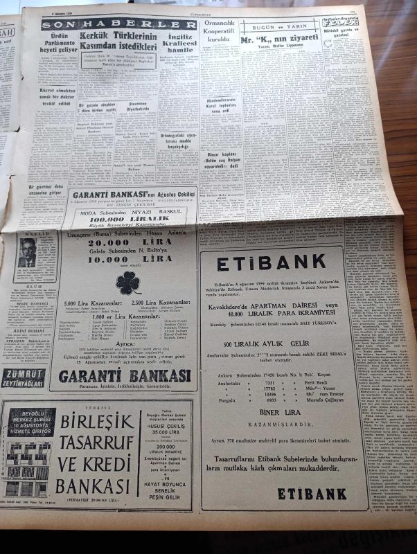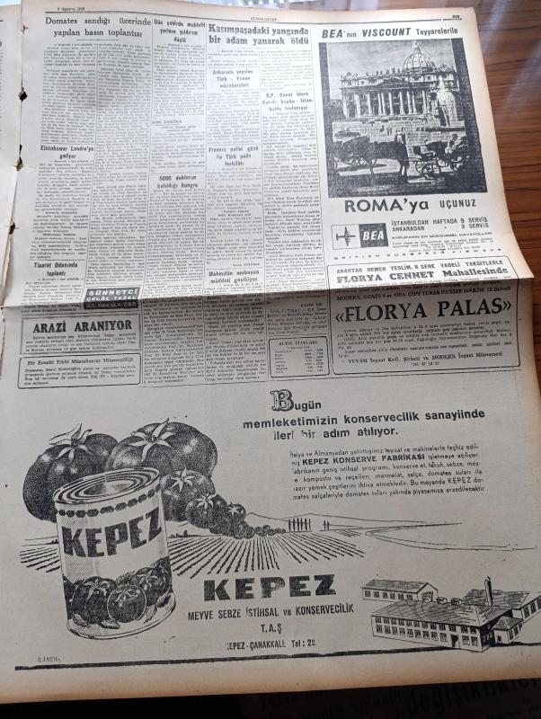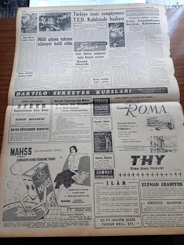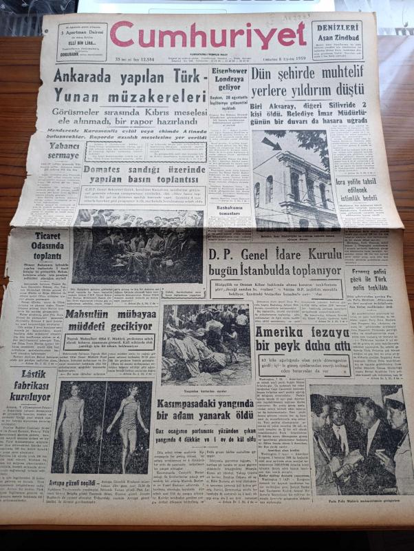 Cumhuriyet Gazetesi-8 Ağustos 1959-Kepez konserve- Ortadirek Yazan Yaşar Kemal Yazı Dizisi - Uluç Ali Yazan Halikarnas Balıkçısı Yazı Dizisi - Hasan Ali Yücel Köşe Yazısı - Burhan Felek Köşe Yazısı - Ankara'da Yapılan Türk Yunan Müzakereleri - Dün İstanbul'da Muhtelif Yerlere Yıldırım Düştü 2 Kişi Oldu- Fransız Polisi Gözü İle Türk Polis Teşkilatı - Avrupa Güzeli Yunan Güzeli Pasi Lerenti Seçildi - Başbakan Adnan Menderes'in Temasları - Amerika'ya Fezaya Bir Peyk Daha Attı - Kerkük Türklerinin General Kasım'dan İstedikleri - Amerikan Cumhurbaşkanı Adayı Stevenson Diyarbakır'da - Ormancılık Kooperatifi Kuruldu - Hindistan'da Sinema Yıldızları 15 Film Birden Çeviriyorlar - Ufa Mutbak Margarini - Suat Mamat'ın Transfer Hikayesi - Türkiye Tenis Şampiyonası T.E.D. Kulübünde Başlıyor - Millî Ligin 20 Takımı - Dolmabahçe Stadının Çocukları - Merhum Yüzücüler Kupası Yarışları - Ferdi Atletizm Şampiyonası Bugün Konya'da Yapılıyor - Mahss Çamaşır Tozu - THY - Steyr Kamyon - Boğaziçi Spor Kulübü, Yunus Nadi tarafından kaleme alınmıştır. Cumhuriyet Gazetesi-8 Ağustos 1959-Kepez konserve- Ortadirek Yazan Yaşar Kemal Yazı Dizisi - Uluç Ali Yazan Halikarnas Balıkçısı Yazı Dizisi - Hasan Ali Yücel Köşe Yazısı - Burhan Felek Köşe Yazısı - Ankara'da Yapılan Türk Yunan Müzakereleri - Dün İstanbul'da Muhtelif Yerlere Yıldırım Düştü 2 Kişi Oldu- Fransız Polisi Gözü İle Türk Polis Teşkilatı - Avrupa Güzeli Yunan Güzeli Pasi Lerenti Seçildi - Başbakan Adnan Menderes'in Temasları - Amerika'ya Fezaya Bir Peyk Daha Attı - Kerkük Türklerinin General Kasım'dan İstedikleri - Amerikan Cumhurbaşkanı Adayı Stevenson Diyarbakır'da - Ormancılık Kooperatifi Kuruldu - Hindistan'da Sinema Yıldızları 15 Film Birden Çeviriyorlar - Ufa Mutbak Margarini - Suat Mamat'ın Transfer Hikayesi - Türkiye Tenis Şampiyonası T.E.D. Kulübünde Başlıyor - Millî Ligin 20 Takımı - Dolmabahçe Stadının Çocukları - Merhum Yüzücüler Kupası Yarışları - Ferdi Atletizm Şampiyonası Bugün Konya'da Yapılıyor - Mahss Çamaşır Tozu - THY - Steyr Kamyon - Boğaziçi Spor Kulübü adlı eser Türkçe dilindedir.