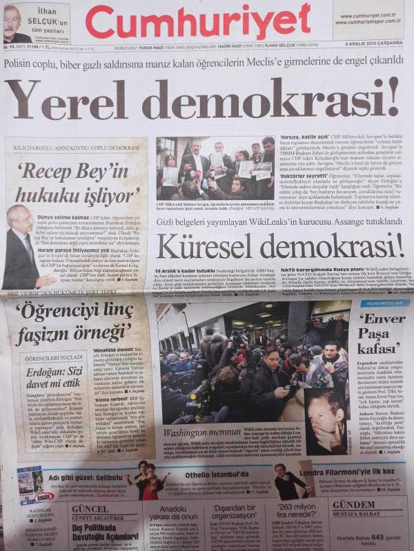 Cumhuriyet Gazetesi - 8 Aralık 2010 - Kemal Kılıçdaroğlu - Hikmet Çetinkaya - Ergin Yıldızoğlu - Güray Öz - Deniz Kavukçuoğlu - Turgay Fişekçi - Abbas Güçlü - Semiha Berksoy - Levent Gencelli - Yıpranma, Sararma, Yırtılmalar Zamana Bağlı Olarak Görülebilir.
