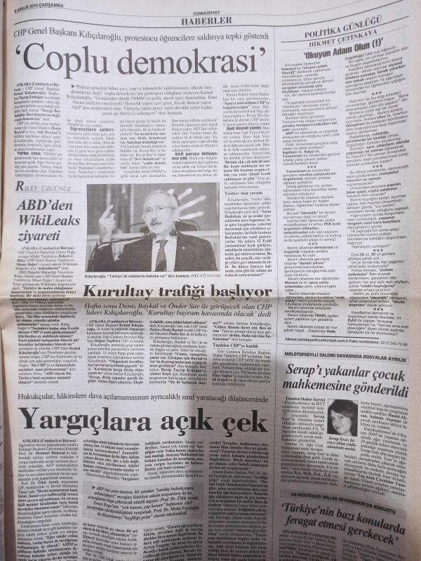 Cumhuriyet Gazetesi - 8 Aralık 2010 - Kemal Kılıçdaroğlu - Hikmet Çetinkaya - Ergin Yıldızoğlu - Güray Öz - Deniz Kavukçuoğlu - Turgay Fişekçi - Abbas Güçlü - Semiha Berksoy - Levent Gencelli -, Cumhuriyet Yayınları tarafından kaleme alınmıştır. Cumhuriyet Gazetesi - 8 Aralık 2010 - Kemal Kılıçdaroğlu - Hikmet Çetinkaya - Ergin Yıldızoğlu - Güray Öz - Deniz Kavukçuoğlu - Turgay Fişekçi - Abbas Güçlü - Semiha Berksoy - Levent Gencelli - adlı eser Türkçe dilindedir.