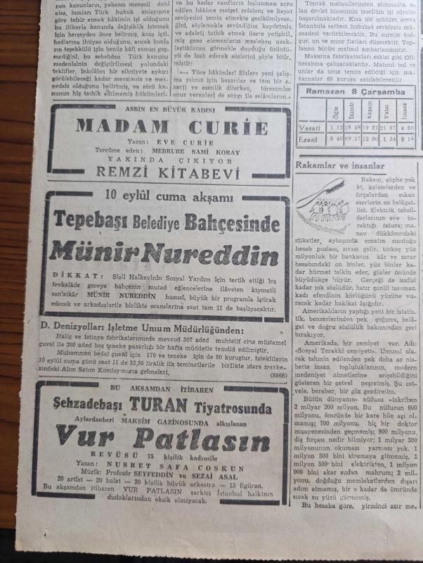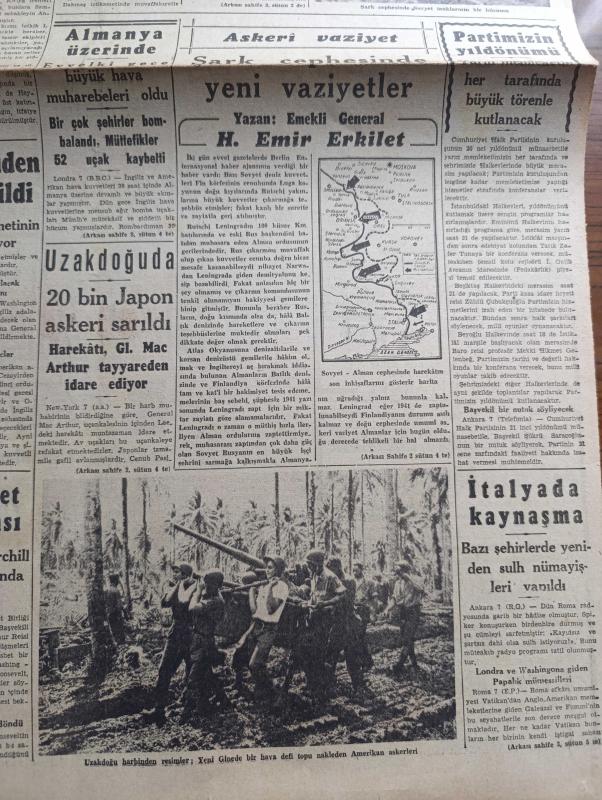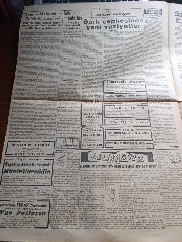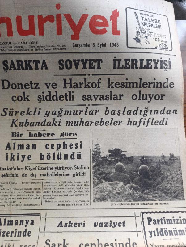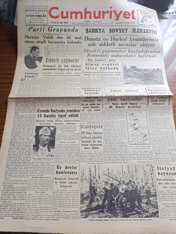 Cumhuriyet Gazetesi - 8 Eylül 1943 - anahtar kimde yazan Nadir Nadi Başmakale - Parti grubunda hariciye vekili Numan Menemecioğlu Dün 2 saat süren beyanatta bulundu - Şarkta Sovyet ilerleyişi - Donetz Ve Harkof kesimlerinde çok şiddetli savaşlar oluyor - Almanya üzerinde evvelki gece büyük hava muharebeleri oldu - Cenubi İtalya'da yeniden 12 kasaba işgal edildi - Uzakdoğu'da 20.000 Japon askeri sarıldı - askeri vaziyet yazan Emekli General H. Emir Erkilet Yazı Dizisi - Uzakdoğu harbiden resimler - İtalyan ordularının kumandasını eline alan Veliaht Prens Umberto - Münir Nurettin Selçuk Tepebaşı belediye bahçesinde - vur patlasın revüsü Şehzadebaşı Turan tiyatrosunda - Ali Baba'nın rüyası Saray sinemasında - Topuzun Kısmeti Yazan Mahmut Yesari Yazı Dizisi - Roji Szabo Konseri - Türkiye spor ansiklopedisi - Ruslara göre 2 aylık Alman kaybı - Safiye Ayla yalnız Kadıköy İnci Gazinosunda - Suzan Yakar her akşam Taksim kristalde - bugünkü radyo programı - Erler Türk Anonim Şirketi adlı eser, Kitap > Süreli Yayınlar > Gazeteler > Türkiye > Genel > Günlük kategorisinde İkinci El olarak satıştadır.