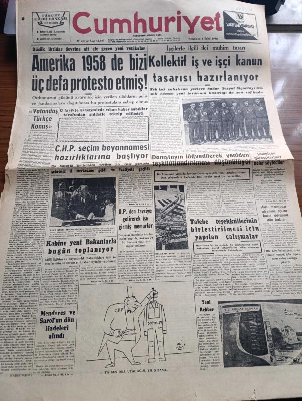 Cumhuriyet Gazetesi - 8 Eylül 1960 - Vatandaş Türkçe Konuş Yazan Nadir Nadi Köşe Yazısı - Düşük İktidar Devrine Ait Ele Geçen Yeni Vesikalar - Amerika 1958 de Bizi Üç Defa Protesto Etmiş - CHP Seçim Beyannamesi Hazırlıklarına Başlıyor - İşçilerle İlgili İki Mühim Tasarı - Kolektif İş Ve İşçi Kanun Tasarısı Hazırlanıyor - Şampiyon Güreşçilerimiz Neler Söylediler - Akis Mecmuası Aleyhine Açılan Basın Davasına Dün Bakıldı - Mükerrem Sarol Ve Adnan Menderes'in İfadeleri Alındı - Sabah Şarkısı Yazan Taylor Caldwell Yazı Dizisi - Kongolular Birleşmiş Milletlerin Elinde Bulunan Radyo Evini İşgal Ettiler - Resimli Roman Başkasının Günahı Çizen Yves Sayol - Patti Çizgi Roman - Kilisede Cinayet Yazan Georges Simenon Yazı Dizisi - Bay Oscar Karikatür - Asım'ın Nesli Ve Devrim Kuşakları Yazan Ömer Ünsal - Metin Oktay Cezalı - Pistlerin İlahları Konuşuyor - Ferdi Yarışmada Nail Gönenli İle Cevdet Sümer 2. Tura Kaldılar - Dünkü Müsabakalarda Yeni Rekorlar Kırıldı - Erdoğan Akpınar - Arı Bisküvileri adlı eser, Kitap > Süreli Yayınlar > Gazeteler > Türkiye > Genel > Günlük kategorisinde İkinci El olarak satıştadır.