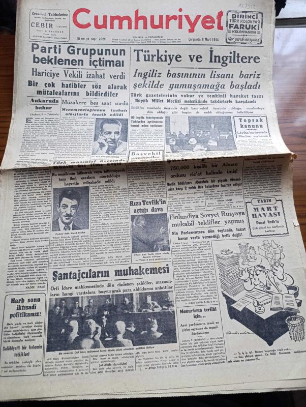 Cumhuriyet Gazetesi - 8 Mart 1944 - Ankara'da Bahar Yazan Nadir Nadi Köşe Yazısı - Parti Grubunun Beklenen İçtimai - Hariciye Vekili Numan Menemencioğlu İzahat Verdi - Türk Musikisi Üzerinde Mühim Bir Keşif - Profesör Salih Murad Uzdilek - Türkiye ve İngiltere İngiliz Basınının Lisanı Bariz Şekilde Yumuşamaya Başladı - Toprak Kanunu - Başvekil Şükrü Saracoğlu Gazeteciler İle Görüştü - Rıza Tevfik'in Açtığı Dava - Finlandiya Sovyet Rusya'ya Mukabil Teklifler Yapmış - Askeri Vaziyet Yazan Emekli General H. Emir Erkilet Yazı Dizisi - Marion'nun Kalbi Yazan Vicky Baum Yazı Dizisi - Amerikalı Sanatkarlar Geldi - Ayarsızlar Oyunu Şehir Tiyatrosu Komedi Kısmında Bu Akşam Başlıyor - Küçük Hikaye Bir Tecrübe Çeviren Hamdi Varoğlu - Amcabeye Göre Çizen Cemal Nadir - Çıplak Aşıklar Milli Ve Alemdar Sinemalarında - Celladın Baltası Altında Şehzadebaşı Turan Sinemasında - Bugünkü Radyo Programı - Ses Tiyatrosu Temsilleri - Nevrozin - Bulmaca - Tiku Meşhur Dolma Kalemleri