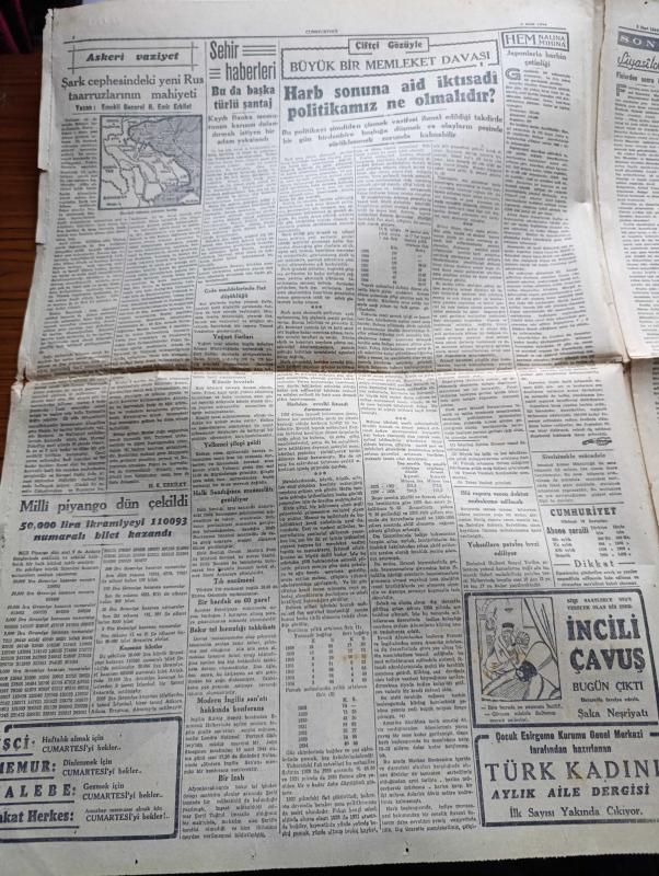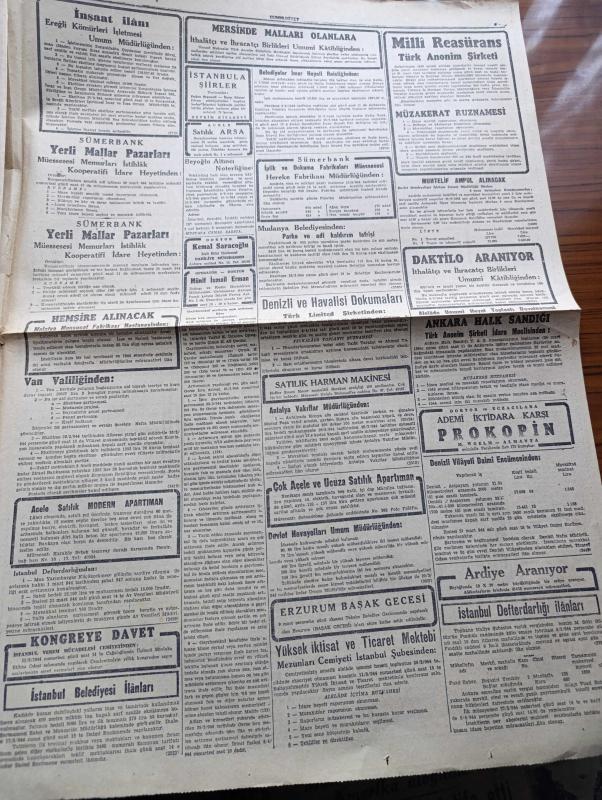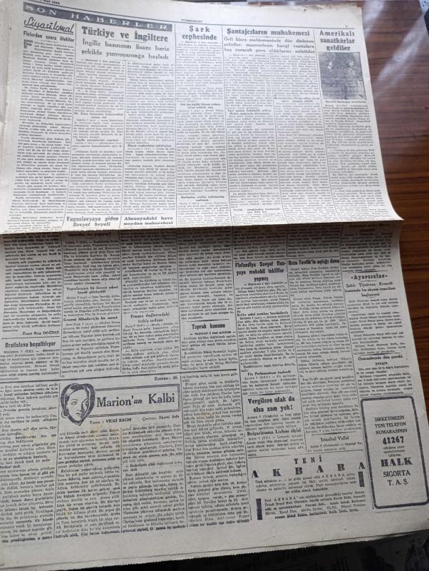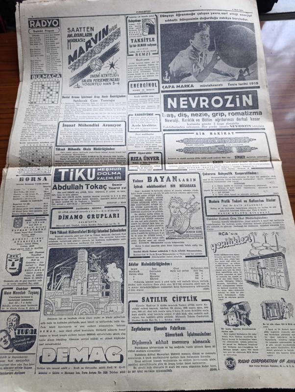 Cumhuriyet Gazetesi - 8 Mart 1944 - Ankara'da Bahar Yazan Nadir Nadi Köşe Yazısı - Parti Grubunun Beklenen İçtimai - Hariciye Vekili Numan Menemencioğlu İzahat Verdi - Türk Musikisi Üzerinde Mühim Bir Keşif - Profesör Salih Murad Uzdilek - Türkiye ve İngiltere İngiliz Basınının Lisanı Bariz Şekilde Yumuşamaya Başladı - Toprak Kanunu - Başvekil Şükrü Saracoğlu Gazeteciler İle Görüştü - Rıza Tevfik'in Açtığı Dava - Finlandiya Sovyet Rusya'ya Mukabil Teklifler Yapmış - Askeri Vaziyet Yazan Emekli General H. Emir Erkilet Yazı Dizisi - Marion'nun Kalbi Yazan Vicky Baum Yazı Dizisi - Amerikalı Sanatkarlar Geldi - Ayarsızlar Oyunu Şehir Tiyatrosu Komedi Kısmında Bu Akşam Başlıyor - Küçük Hikaye Bir Tecrübe Çeviren Hamdi Varoğlu - Amcabeye Göre Çizen Cemal Nadir - Çıplak Aşıklar Milli Ve Alemdar Sinemalarında - Celladın Baltası Altında Şehzadebaşı Turan Sinemasında - Bugünkü Radyo Programı - Ses Tiyatrosu Temsilleri - Nevrozin - Bulmaca - Tiku Meşhur Dolma Kalemleri adlı eser, Kitap > Süreli Yayınlar > Gazeteler > Türkiye > Genel > Günlük kategorisinde İkinci El olarak satıştadır.