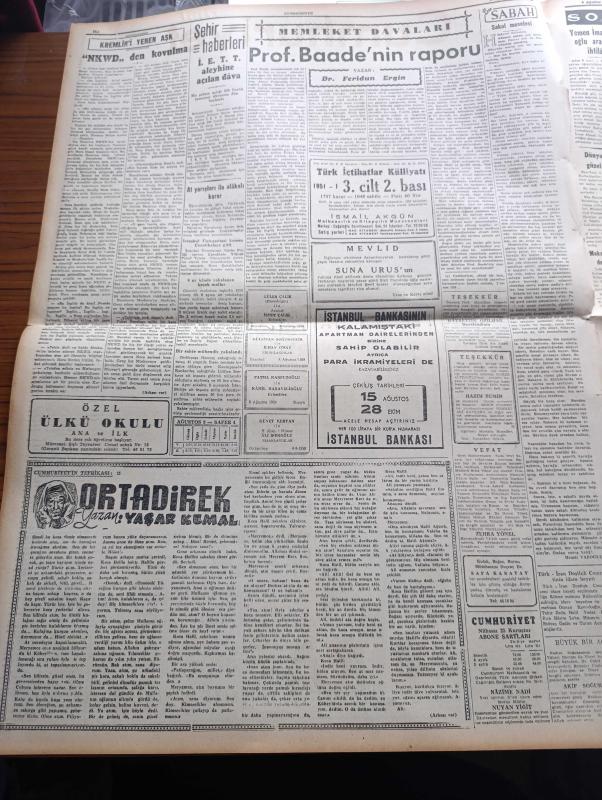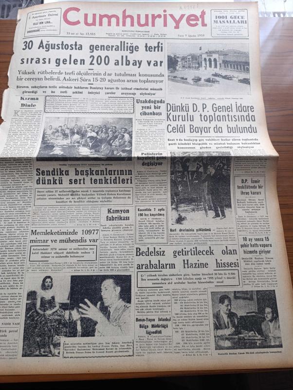 Cumhuriyet Gazetesi - 9 Ağustos 1959 - Ortadirek Yazan Yaşar Kemal Yazı Dizisi - Uluç Ali Yazan Halikarnas Balıkçısı Yazı Dizisi - Nadir Nadi Köşe Yazısı - 30 Ağustos'ta Generalliğe Terfi Sırası Gelen 200 Albay Var - Kuzey Vietnam'da Komünistler Laos'a hücuma Hazır - 10 Ay Sonra 15 Şehir Hattı Vapuru Hizmete Giriyor - Memleketimizde 10977 Mimar Ve Mühendis Var - Sendika Başkanlarının Dünkü Sert Tenkidleri - Polislerin Kıyafeti Gene Değişiyor - İzmit Yakınlarında Açılan Kamyon Fabroqksi- Profesör Baade'nin Raporu Yazan Doktor Feridun Ergin - Rita Hayworth - Elizabeth Taylor - Sularımızda Balık Avlayan 3 Yunanlı Tevkif Edildi - Haliç'in Taranması İşi İhaleye Çıkıyor - Beynelmilel Şarkı Festivali - Dünya Kadınlar Birliği Başkanı Ezlynn Deraniyagala Geliyor - Doğan Nadi - Haftanın Şakaları Yazan Burhan Felek - Beşiktaş Beyoğluspor'u 3 O Mağlup Etti - Ferdi Atletizm Şampiyonası Başladı - Ahmed Reis Yelken Yarışları Yapıldı - Fenerbahçe Kasımpaşa Oynuyor - Fulda Lastikleri - Karagümrük, Yunus Nadi tarafından kaleme alınmıştır. Cumhuriyet Gazetesi - 9 Ağustos 1959 - Ortadirek Yazan Yaşar Kemal Yazı Dizisi - Uluç Ali Yazan Halikarnas Balıkçısı Yazı Dizisi - Nadir Nadi Köşe Yazısı - 30 Ağustos'ta Generalliğe Terfi Sırası Gelen 200 Albay Var - Kuzey Vietnam'da Komünistler Laos'a hücuma Hazır - 10 Ay Sonra 15 Şehir Hattı Vapuru Hizmete Giriyor - Memleketimizde 10977 Mimar Ve Mühendis Var - Sendika Başkanlarının Dünkü Sert Tenkidleri - Polislerin Kıyafeti Gene Değişiyor - İzmit Yakınlarında Açılan Kamyon Fabroqksi- Profesör Baade'nin Raporu Yazan Doktor Feridun Ergin - Rita Hayworth - Elizabeth Taylor - Sularımızda Balık Avlayan 3 Yunanlı Tevkif Edildi - Haliç'in Taranması İşi İhaleye Çıkıyor - Beynelmilel Şarkı Festivali - Dünya Kadınlar Birliği Başkanı Ezlynn Deraniyagala Geliyor - Doğan Nadi - Haftanın Şakaları Yazan Burhan Felek - Beşiktaş Beyoğluspor'u 3 O Mağlup Etti - Ferdi Atletizm Şampiyonası Başladı - Ahmed Reis Yelken Yarışları Yapıldı - Fenerbahçe Kasımpaşa Oynuyor - Fulda Lastikleri - Karagümrük adlı eser Türkçe dilindedir.