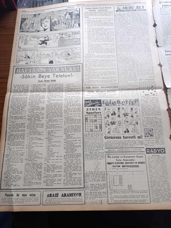 Cumhuriyet Gazetesi - 9 Ağustos 1959 - Ortadirek Yazan Yaşar Kemal Yazı Dizisi - Uluç Ali Yazan Halikarnas Balıkçısı Yazı Dizisi - Nadir Nadi Köşe Yazısı - 30 Ağustos'ta Generalliğe Terfi Sırası Gelen 200 Albay Var - Kuzey Vietnam'da Komünistler Laos'a hücuma Hazır - 10 Ay Sonra 15 Şehir Hattı Vapuru Hizmete Giriyor - Memleketimizde 10977 Mimar Ve Mühendis Var - Sendika Başkanlarının Dünkü Sert Tenkidleri - Polislerin Kıyafeti Gene Değişiyor - İzmit Yakınlarında Açılan Kamyon Fabroqksi- Profesör Baade'nin Raporu Yazan Doktor Feridun Ergin - Rita Hayworth - Elizabeth Taylor - Sularımızda Balık Avlayan 3 Yunanlı Tevkif Edildi - Haliç'in Taranması İşi İhaleye Çıkıyor - Beynelmilel Şarkı Festivali - Dünya Kadınlar Birliği Başkanı Ezlynn Deraniyagala Geliyor - Doğan Nadi - Haftanın Şakaları Yazan Burhan Felek - Beşiktaş Beyoğluspor'u 3 O Mağlup Etti - Ferdi Atletizm Şampiyonası Başladı - Ahmed Reis Yelken Yarışları Yapıldı - Fenerbahçe Kasımpaşa Oynuyor - Fulda Lastikleri - Karagümrük adlı eser, Kitap > Süreli Yayınlar > Gazeteler > Türkiye > Mahalli > Günlük kategorisinde İkinci El olarak satıştadır.