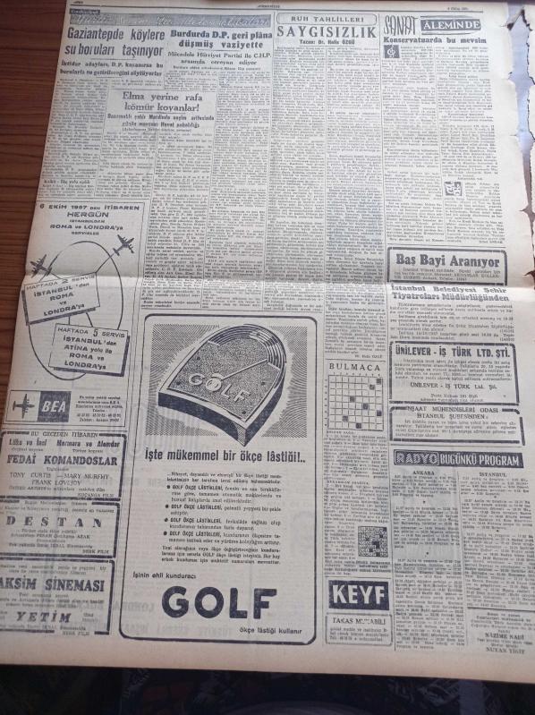 Cumhuriyet Gazetesi - 9 Ekim 1957 - Aday Listesinin Neşrinden Sonra Demokrat Parti'de İstifalar Arttı - Cumhuriyet Halk Partisinin Duvar Afişlerinden Biri - Nadir Nadi - Cumhuriyetçi Millet Partisi Genel Başkanı Osman Bölükbaşı Bugün Muhakeme Ediliyor - Rus Diktatörü Hrutçef Bizi Tehdit Ediyor - Kadınlar Da Siyasi Parti Kuruyorlar - Profesör Hüseyin Nail Kubalı - 20 Liraya Bir Yahudi Yazı Dizisi - İblisin Kızı Yazan Guy Des Cars Yazı Dizisi - Münci Kapani - Burhan Felek - Meşhur Bir Bale Geliyor Ballets Jean Babilee - Golf Ökçe Lastiği - Ruh Tahlilleri - Vali Fahrettin Kerim Gökay Demokrat Parti İl Merkezini Ziyaret Etti - Türkiye İngiltere Milli Futbol Maçı Kesinleşti - 19 Mayıs Stadının Açılış Merasimi İçin Fenerbahçe Galatasaray Karması Çağrıldı - Asya Gribi Ve Nezleden Enflucide Uras Korur adlı eser, Kitap > Süreli Yayınlar > Gazeteler > Türkiye > Genel > Günlük kategorisinde İkinci El olarak satıştadır.