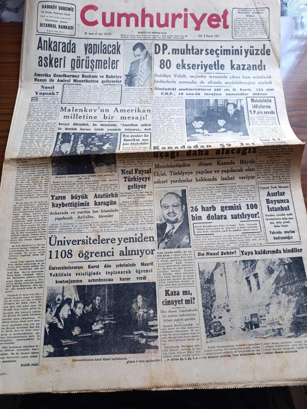 Cumhuriyet Gazetesi - 9 Kasım 1954 - Nasıl Yapsak Yazan Nadir Nadi Başmakale - Ankara'da Yapılacak Askeri Görüşmeler - Amerika Genelkurmay Başkanı Ve Bahriye Nazırı İle Amiral Mountbatten Geliyorlar - Malenkov'un Amerikan Milletine Bir Mesajı - Demokrat Parti Muhtar Seçimini Yüzde 80 Ekseriyetle Kazandı - Rus Avcıları Bir Amerikan Uçağını Düşürdüler - Kanadadan 59 Jet Uçağı Alacağız - 26 Harp Gemisi 100 Bin Dolara Satılıyor - Yarın Büyük Atatürk'ü Kaybettiğimiz Karagün - İstanbul'da 16992 Motorlu Vasıta Var - Şehir Meseleleri Yazan Burhan Felek Köşe Yazısı - Reşid Paşa'nın Heykelinin Dikilmesi İçin Bir Takrir - Artist Silvano Mangano Geliyor - Türkiye Mısır Milli Maçı - 57 Kilo Serbest Güreş Şampiyonu Mustafa Dağıstanlı Askerliğini Bitirdi - Şehir Tiyatrosu Dram Kısmında Beyaz Güvercin - Şen Ses Tiyatrosunda Fındık Kurdu Opereti - Korsanlar Adası Filmi Lale Ve Elhamra Sinemasında - Zoraki Diplomat Yazan Yakup Kadri Karaosmanoğlu Yazı Dizisi - Meşhur Aktör Marlon Brando'nun Sevdiği Kız adlı eser, Kitap > Süreli Yayınlar > Gazeteler > Türkiye > Genel > Günlük kategorisinde İkinci El olarak satıştadır.
