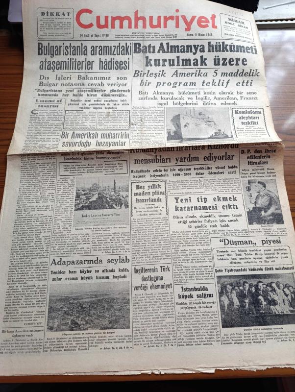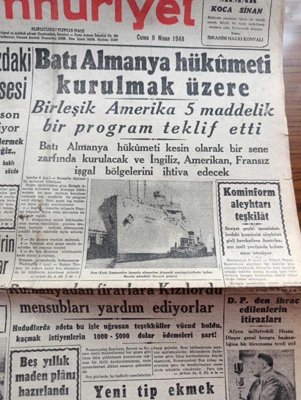 Cumhuriyet Gazetesi - 9 Nisan 1948 - Umumi Af Tasarısı Köşe Yazısı - Bulgaristanla Aramızdaki Ataşemiliterler Hadisesi - Batı Almanya'da Hükümet Kurulmak Üzere Birleşik Amerika 5 Maddelik Bir Program Teklif Etti - Bir Amerikalı Yazara Göre Türk Rus Savaşında Bizim 4 Günden Fazla Dayanabileceğimize İstanbul'da Kimse İnanmıyormuş - Adapazarı'nda Sel Fotoğraf - Romanya'dan Firarlara Kızılordu Mensupları Yardım Ediyorlar - Beş Yıllık Maden Planı - Yeni Tip Ekmek Kararnamesi Çıktı - İstanbul'da Köpek Salgını - Düşman Piyesi Şehir Tiyatrosundaki Hadise'nin Dünkü Muhakemesi Fotoğraf - Goebbels'in Hatıraları Yazı Dizisi - Damga Filmi Taksim Sinemasında - Türkiye İktisat Mecmuası 3. Sayısı Çıktı - John Steinbeck'in Gazap Üzümleri Remzi Kitabevinde - Huzur Yazan Ahmet Hamdi Tanpınar Yazı Dizisi - Çimento Meselesi Yazan Burhan Felek Köşe Yazısı - Austin 1948 Model Binek Otomobilleri - Bugünkü Radyo Programı - Muammer Karaca Opereti Maksimde Hangisi Oyunu - Dermoliv Uyuz Ve Deri Hastalığı İçin adlı eser, Kitap > Süreli Yayınlar > Gazeteler > Türkiye > Genel > Günlük kategorisinde İkinci El olarak satıştadır.