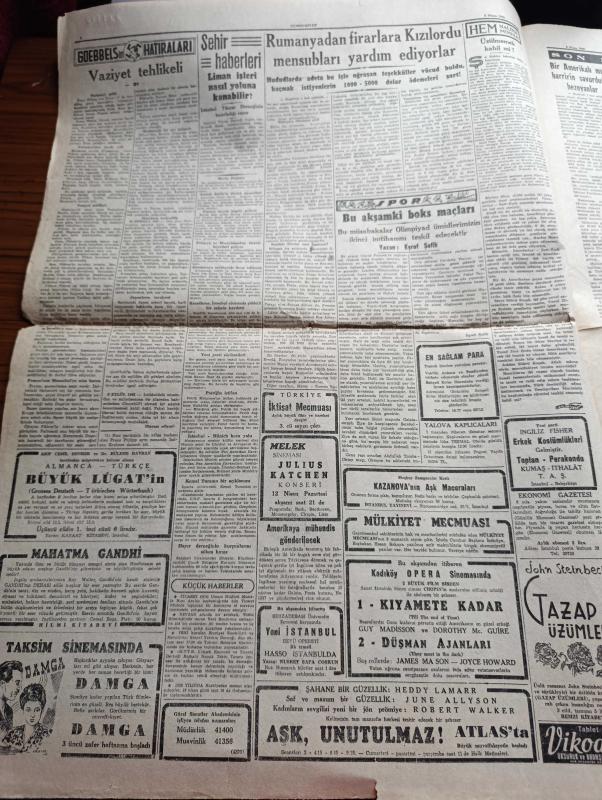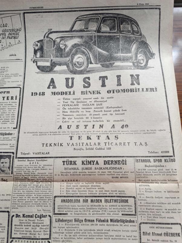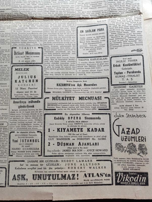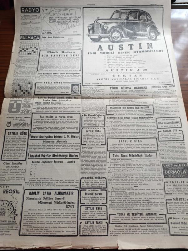 Cumhuriyet Gazetesi - 9 Nisan 1948 - Umumi Af Tasarısı Köşe Yazısı - Bulgaristanla Aramızdaki Ataşemiliterler Hadisesi - Batı Almanya'da Hükümet Kurulmak Üzere Birleşik Amerika 5 Maddelik Bir Program Teklif Etti - Bir Amerikalı Yazara Göre Türk Rus Savaşında Bizim 4 Günden Fazla Dayanabileceğimize İstanbul'da Kimse İnanmıyormuş - Adapazarı'nda Sel Fotoğraf - Romanya'dan Firarlara Kızılordu Mensupları Yardım Ediyorlar - Beş Yıllık Maden Planı - Yeni Tip Ekmek Kararnamesi Çıktı - İstanbul'da Köpek Salgını - Düşman Piyesi Şehir Tiyatrosundaki Hadise'nin Dünkü Muhakemesi Fotoğraf - Goebbels'in Hatıraları Yazı Dizisi - Damga Filmi Taksim Sinemasında - Türkiye İktisat Mecmuası 3. Sayısı Çıktı - John Steinbeck'in Gazap Üzümleri Remzi Kitabevinde - Huzur Yazan Ahmet Hamdi Tanpınar Yazı Dizisi - Çimento Meselesi Yazan Burhan Felek Köşe Yazısı - Austin 1948 Model Binek Otomobilleri - Bugünkü Radyo Programı - Muammer Karaca Opereti Maksimde Hangisi Oyunu - Dermoliv Uyuz Ve Deri Hastalığı İçin, Yunus Nadi tarafından kaleme alınmıştır. Cumhuriyet Gazetesi - 9 Nisan 1948 - Umumi Af Tasarısı Köşe Yazısı - Bulgaristanla Aramızdaki Ataşemiliterler Hadisesi - Batı Almanya'da Hükümet Kurulmak Üzere Birleşik Amerika 5 Maddelik Bir Program Teklif Etti - Bir Amerikalı Yazara Göre Türk Rus Savaşında Bizim 4 Günden Fazla Dayanabileceğimize İstanbul'da Kimse İnanmıyormuş - Adapazarı'nda Sel Fotoğraf - Romanya'dan Firarlara Kızılordu Mensupları Yardım Ediyorlar - Beş Yıllık Maden Planı - Yeni Tip Ekmek Kararnamesi Çıktı - İstanbul'da Köpek Salgını - Düşman Piyesi Şehir Tiyatrosundaki Hadise'nin Dünkü Muhakemesi Fotoğraf - Goebbels'in Hatıraları Yazı Dizisi - Damga Filmi Taksim Sinemasında - Türkiye İktisat Mecmuası 3. Sayısı Çıktı - John Steinbeck'in Gazap Üzümleri Remzi Kitabevinde - Huzur Yazan Ahmet Hamdi Tanpınar Yazı Dizisi - Çimento Meselesi Yazan Burhan Felek Köşe Yazısı - Austin 1948 Model Binek Otomobilleri - Bugünkü Radyo Programı - Muammer Karaca Opereti Maksimde Hangisi Oyunu - Dermoliv Uyuz Ve Deri Hastalığı İçin adlı eser Türkçe dilindedir.
