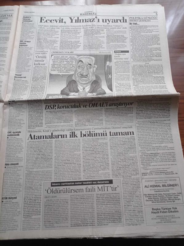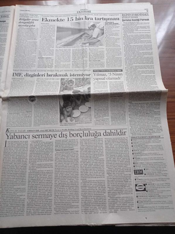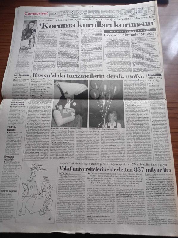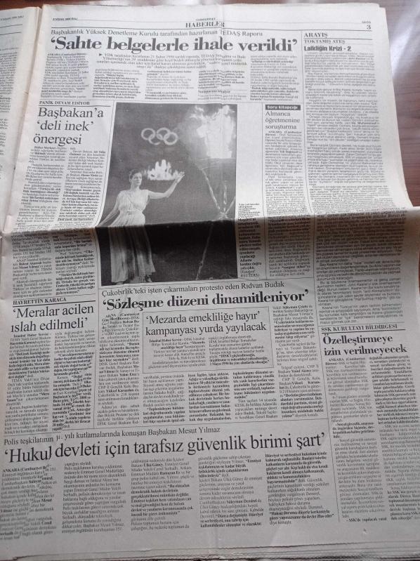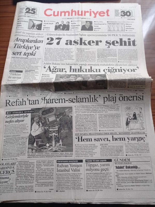 Cumhuriyet Gazetesi - 9 Nisan 1996 - Balkan Artistik Buz Pateni Şampiyonası'nda Sırma Altay - Naim Süleymanoğlu Olimpiyatlar İçin İddialı - Mehmet Ağar Hukuku Çiğniyor - Refah Partisi'nden Harem Selamlık Plaj Önerisi - Bir Sinema Ustası Michelangelo Antonioni Yaşam Boyu Onur Ödülü Aldı - Erzincan Valisi Recep Yazıcıoğlu Atamada Ölçüyü Kaçırdılar - Rıdvan Yenişen İstanbul Vakisi- İsrail'le Yapılan Askeri Anlaşma Sebebiyle Araplardan Türkiye'ye Sert Tepki - 27 Asker Şehit adlı eser Türkçe dilindedir.