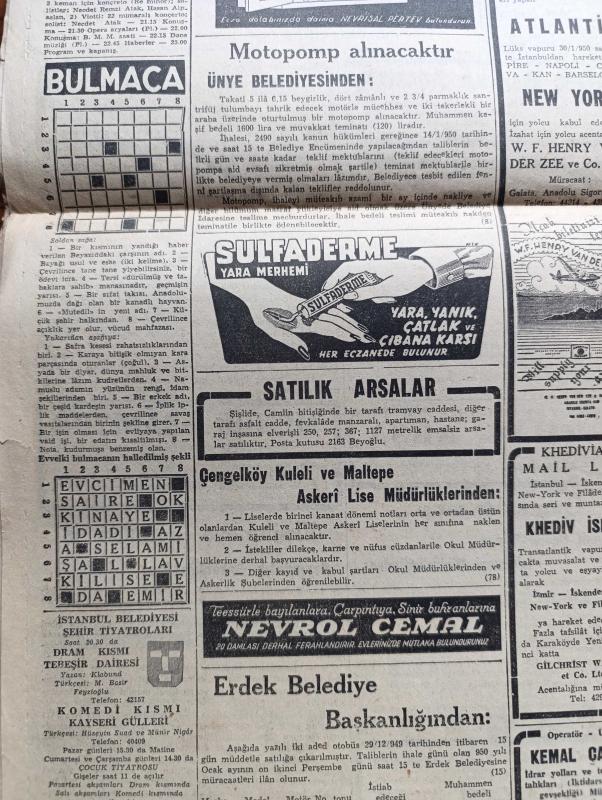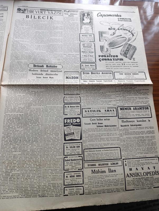 Cumhuriyet Gazetesi - 9 Ocak 1950 - Çin'deki Realite Karşısında Yazan Abidin Daver Köşe Yazısı - Asya Komünizme Karşı Tedbirler Alınıyor - Colombo Konferansı - Ticaret Filomuza Dair Gerilen Sözlü Soru - Moskova'da 3 Yıl Yazan Bedell Smith Yazı Dizisi - Rusya'yı İdare Edenler Bunların Başında Stalin'den Sonra Malenkov Geliyor - Fenerbahçe Vefa'yı Yendi Fotoğraf - Verem Savaşımızda Propagandanın Rolü Yazan Doktor Kemal Saraçoğlu - Einstein'ın Teorisi Anlaşılamadı - Sapa Yol Yazan Concordia Merrel - Sinema Artisti Tyrone Power İle Eşini Soydular - Fenerbahçe B Takımı Gol Rekoru Kırdı Fenerbahçe Şişliyi 18 0 Yendi - Galatasaray Beyoğlunu 4 2 Yendi - Ankara'da Bir Komiser Geldi Ve Küçük Tiyatronun İkinci Yıldönümü Yazan Lütfi Ay - Ölüme Doğru Yazan Agatha Christie Yazı Dizisi - 1949 un En Mühim Keşif Ve İcatları - Yeni Bulunan Radyo Teleskop Fotoğraf - 1949 1950 Yunus Nadi Mükafatı Bir Yurt Yazısı Bilecik - Çapamarka Çorbalık - Bugünkü Radyo Programı - Bulmaca - Muammer Karaca Opereti, Yunus Nadi tarafından kaleme alınmıştır. Cumhuriyet Gazetesi - 9 Ocak 1950 - Çin'deki Realite Karşısında Yazan Abidin Daver Köşe Yazısı - Asya Komünizme Karşı Tedbirler Alınıyor - Colombo Konferansı - Ticaret Filomuza Dair Gerilen Sözlü Soru - Moskova'da 3 Yıl Yazan Bedell Smith Yazı Dizisi - Rusya'yı İdare Edenler Bunların Başında Stalin'den Sonra Malenkov Geliyor - Fenerbahçe Vefa'yı Yendi Fotoğraf - Verem Savaşımızda Propagandanın Rolü Yazan Doktor Kemal Saraçoğlu - Einstein'ın Teorisi Anlaşılamadı - Sapa Yol Yazan Concordia Merrel - Sinema Artisti Tyrone Power İle Eşini Soydular - Fenerbahçe B Takımı Gol Rekoru Kırdı Fenerbahçe Şişliyi 18 0 Yendi - Galatasaray Beyoğlunu 4 2 Yendi - Ankara'da Bir Komiser Geldi Ve Küçük Tiyatronun İkinci Yıldönümü Yazan Lütfi Ay - Ölüme Doğru Yazan Agatha Christie Yazı Dizisi - 1949 un En Mühim Keşif Ve İcatları - Yeni Bulunan Radyo Teleskop Fotoğraf - 1949 1950 Yunus Nadi Mükafatı Bir Yurt Yazısı Bilecik - Çapamarka Çorbalık - Bugünkü Radyo Programı - Bulmaca - Muammer Karaca Opereti adlı eser Türkçe dilindedir.