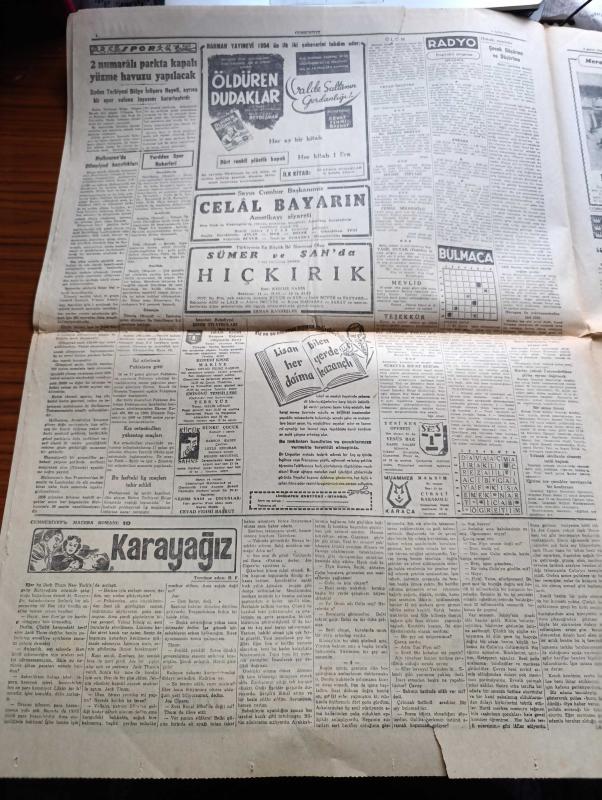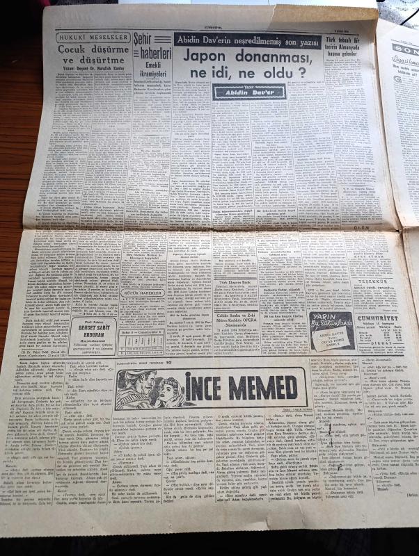 Cumhuriyet Gazetesi - 9 Şubat 1954 - Abidin Daver Yazan Nadir Nadi Köşe Yazısı - Berlin'de Dörtler Gizli İçtimalara Başladılar - Türk Gökü Tatbikatı Başladı - Üstad Abidin Daver Dün Akşam Vefat Etti - Celal Bayar Dün Akşam Los Angeles'e Gitti - Norveçte Sovyet Casusları - Beynelmilel Hukukçular Kongresi - İnce Memed Yazan Yaşar Kemal Yazı Dizisi - Abidin Daver'in Neşredilmemiş Son Yazısı Japon Donanması Ne İdi Ne Oldu - Odun Kömür Ateş Yazan Burhan Felek Köşe Yazısı - Kıbrıs'ta Türk Mezarlığını Rumlar Yol Haline Getirdi - Necmi Rıza Konseri Melek Sinemasında - Melbourne'da Olimpiyat Hazırlıkları - İstanbul Belediyesi Şehir Tiyatroları Dram Kısmında Her Şeye Rağmen Komedi Kısmında Makine Oyunu - Yeni Ses Opereti Venüs Bar - Bugünkü Radyo Programı - Aşk Herşeyin Üstünde Yazan Sermet Sami Uysal - Resimli Roman Liman Cinayeti Yazan George Simenon - Abidin Daver'e Ait Hatıralar Fotoğraflar - Beynelmilel Portreler Anastasi Mikoyan - 1953 1954 Yunus Nadi Mükafatı En Güzel Hikaye adlı eser, Kitap > Süreli Yayınlar > Gazeteler > Türkiye > Genel > Günlük kategorisinde İkinci El olarak satıştadır.