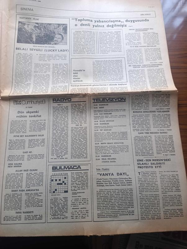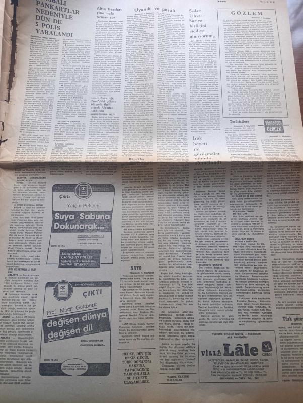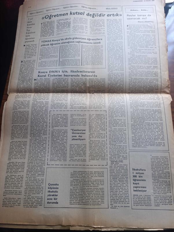 Cumhuriyet Gazetesi - Turkish Newspaper - 12 Eylül 1980 - parlamento bir hükümet feshedildi - silahlı kuvvetler yönetime el koydu - genelkurmay ve Milli Güvenlik konseyi Başkanı Orgeneral Kenan Evren bugün saat 13.00'te Radyo ve televizyondan halka hitap edecek - parlamento üyelerinin dokunulmazlıkları kaldırıldı - teröristlere silah sağlayan bir örgüt ele geçirildi Fotoğrafı - terörün getirdiği yeni yaşam yazan Yalçın Pekşen - dünyada bugün yazan Ali Sirmen - İhsan Sabri'nin eski dosyaları yazan İlhan Selçuk - tarihi yapan kim yazan Melih Cevdet Anday - TÜSİAD üretimdeki yavaşlama kronikleşmiştir - belalı sevgili filminde Burt Reynolds Fotoğrafı - modern eğitim fen dershanesi - radyo ve televizyon programı - Sine Sen mersin'deki silahlı saldırıyı protesto etti - Galatasaray savunma üzerine çalıştı - milli takım baş antrenörü Sabri kiraz - Binicilikte iki bronz kazandık - unutulan Ankara yazan Hıncal Uluç - bombalı pankartlar nedeniyle dün de 5 polis yaralandı - Müşerref Hekimoğlu, Yunus Nadi tarafından kaleme alınmıştır. Cumhuriyet Gazetesi - Turkish Newspaper - 12 Eylül 1980 - parlamento bir hükümet feshedildi - silahlı kuvvetler yönetime el koydu - genelkurmay ve Milli Güvenlik konseyi Başkanı Orgeneral Kenan Evren bugün saat 13.00'te Radyo ve televizyondan halka hitap edecek - parlamento üyelerinin dokunulmazlıkları kaldırıldı - teröristlere silah sağlayan bir örgüt ele geçirildi Fotoğrafı - terörün getirdiği yeni yaşam yazan Yalçın Pekşen - dünyada bugün yazan Ali Sirmen - İhsan Sabri'nin eski dosyaları yazan İlhan Selçuk - tarihi yapan kim yazan Melih Cevdet Anday - TÜSİAD üretimdeki yavaşlama kronikleşmiştir - belalı sevgili filminde Burt Reynolds Fotoğrafı - modern eğitim fen dershanesi - radyo ve televizyon programı - Sine Sen mersin'deki silahlı saldırıyı protesto etti - Galatasaray savunma üzerine çalıştı - milli takım baş antrenörü Sabri kiraz - Binicilikte iki bronz kazandık - unutulan Ankara yazan Hıncal Uluç - bombalı pankartlar nedeniyle dün de 5 polis yaralandı - Müşerref Hekimoğlu adlı eser Türkçe dilindedir.