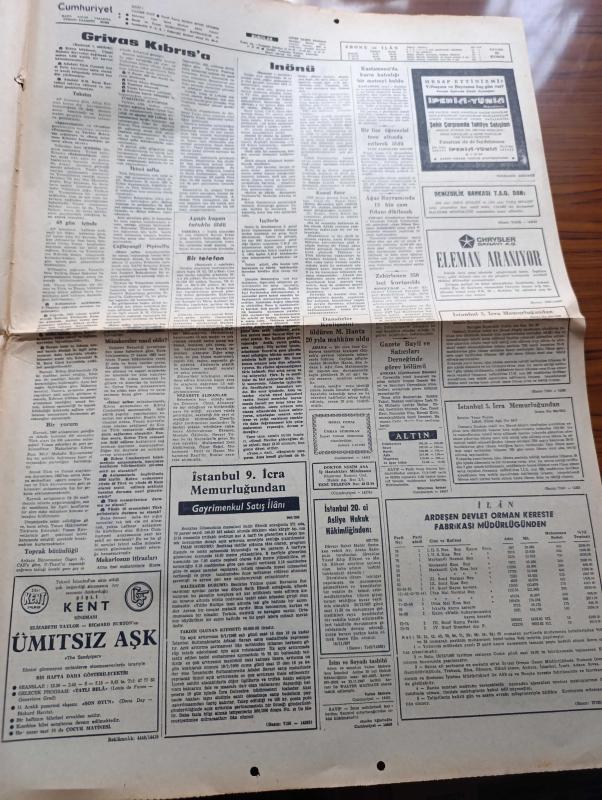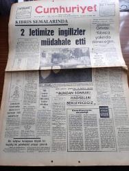 Cumhuriyet Gazetesi - Turkish Newspaper - 2 Aralık 1967 - Kıbrıs semalarında 2 jetimize İngilizler müdahale etti - liberasyon listelerinden ancak zaruri maddeler ithal edilebilecek - ordu mensupları kıta tazminatlarını dün alamadılar - 140 kıpti Ramazan'da davul çalmak için izin istediler - Grivas Kıbrıs'a yakında döneceğim - İsmet İnönü yabancı gazeteciler ve işçilerle görüştü bundan sonraki hadiseleri bekleyeceğiz dedi - Kıbrıs'ta Barış rüzgarları fotoğraf - Alparslan Türkeş'in Süleyman Demirel için gensoru önergesi okunurken Adalet Partisi tepki gösterdi - aylak Musa karikatür - haydi canım sen de yazan İlhan Selçuk - ağaç bayramında 15.000 çam fidanı dikilecek - dansözler kraliçesi Gülruh'u öldüren Muzaffer Hanta 20 yıla mahkum oldu- Yarın Dolmabahçe stadında Fenerbahçe ile Göztepe liderlik maçı yapacak - basketbol liginde 3. Hafta Galatasaray Beşiktaş karşılaşıyor - bugün Hacettepe ile karşılaşacak olan Beşiktaş maça neşe içinde kampta hazırlanmıştır fotoğraf - voleybol adlı eser, Kitap > Süreli Yayınlar > Gazeteler > Türkiye > Genel > Günlük kategorisinde İkinci El olarak satıştadır.