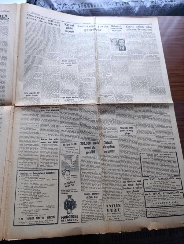 Cumhuriyet Gazetesi - Turkish Newspaper - 20 Şubat 1959 - Adnan Menderes millete radyo ile hitap etti - Başbakan Adnan Menderes Dün yatağından kalktı ve odasında dolaştı - uçak kazasından sonra Adnan Menderes'e ilk yardımı yapan Newdigate'li çiftçi Anthony Bailey ve karısı Margaret fotoğraf - Dr. Fazıl Küçük anlaşmanın imzalandığı Lancaster House'dan çıkarken imzayı müteakip MacMillan Fatin Rüştü Zorlu ve Karamanlis el sıkışırlarken fotoğraf - Londra'da vuku bulan uçak kazasında vefat edenlerin cenazeleri yurda getiriliyor - Başbakan Adnan Menderes uçak kazasından sağ kurtulmuştu - Türkiye'de ilk defa bir ağır ceza mahkemesini 3 kadın hakim idare etmiştir fotoğraf - hükümet meydanı yazan İlhan Tarus Yazı Dizisi - İzmir'de dünkü basın davaları - his ve akıl yolları yazan Burhan Felek - Muhsin Ertuğrul'a dair yazılan yazı davası - Yahya Kemal'i sevenler dün toplandılar - Uluç Ali yazan halikarnas balıkçısı Yazı Dizisi - İstanbul belediyesi şehir tiyatrosu dram kısmında dört albayın aşkı, Yunus Nadi tarafından kaleme alınmıştır. Cumhuriyet Gazetesi - Turkish Newspaper - 20 Şubat 1959 - Adnan Menderes millete radyo ile hitap etti - Başbakan Adnan Menderes Dün yatağından kalktı ve odasında dolaştı - uçak kazasından sonra Adnan Menderes'e ilk yardımı yapan Newdigate'li çiftçi Anthony Bailey ve karısı Margaret fotoğraf - Dr. Fazıl Küçük anlaşmanın imzalandığı Lancaster House'dan çıkarken imzayı müteakip MacMillan Fatin Rüştü Zorlu ve Karamanlis el sıkışırlarken fotoğraf - Londra'da vuku bulan uçak kazasında vefat edenlerin cenazeleri yurda getiriliyor - Başbakan Adnan Menderes uçak kazasından sağ kurtulmuştu - Türkiye'de ilk defa bir ağır ceza mahkemesini 3 kadın hakim idare etmiştir fotoğraf - hükümet meydanı yazan İlhan Tarus Yazı Dizisi - İzmir'de dünkü basın davaları - his ve akıl yolları yazan Burhan Felek - Muhsin Ertuğrul'a dair yazılan yazı davası - Yahya Kemal'i sevenler dün toplandılar - Uluç Ali yazan halikarnas balıkçısı Yazı Dizisi - İstanbul belediyesi şehir tiyatrosu dram kısmında dört albayın aşkı adlı eser Türkçe dilindedir.
