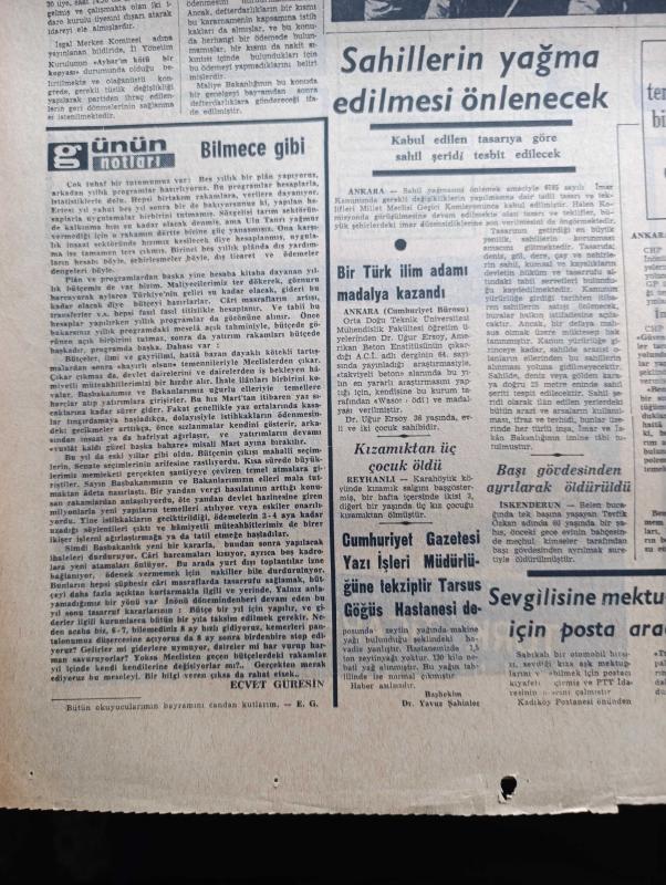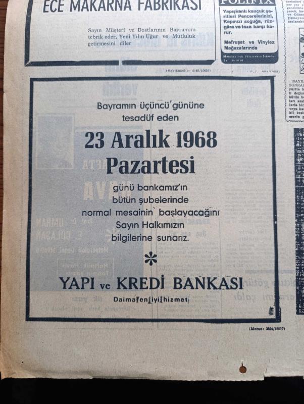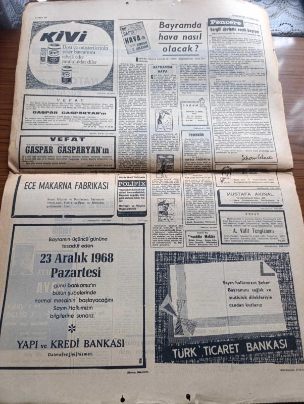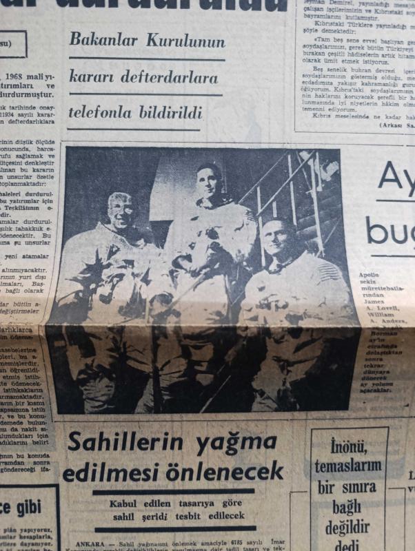 Cumhuriyet Gazetesi - Turkish Newspaper - 21 Aralık 1968 - bilmece gibi yazan Ecvet Güresin Başmakale - cari harcama ve bazı yatırımlar durduruldu - bakanlar kurulunun kararı defterdarlara telefonla bildirildi - İstanbul Türkiye İşçi Partisi merkezi işgal edildi - ay yolculuğu bugün başlıyor - James Lovell Frank Borman ve William Anders ay'ın etrafında dolaştıktan sonra tekrar dünyaya dönerek ay yolunu açacaklar fotoğraf - sahillerin yağma edilmesi önlenecek - Türk bilim adamı Uğur Ersoy madalya kazandı - İsmet İnönü temasların bir sınıra bağlı değildir dedi - Kıbrıs'ta mücahitlere alarm verildi - sevgilisine mektup götürmek için posta aracını çaldı - Kivi enerji kaynağı dost ve müşterilerinin şeker bayramını tebrik eder - bayramda hava nasıl olacak yazan Profesör Doktor Ümran E. Çölaşan - vergili devlette zamlı bayram yazan İlhan Selçuk - Türk Ticaret Bankası Sayın halkımızın şeker bayramını kutlar - Yapı ve Kredi Bankası bayramın üçüncü gününde normal mesaiye başlayacak -, Yunus Nadi tarafından kaleme alınmıştır. Cumhuriyet Gazetesi - Turkish Newspaper - 21 Aralık 1968 - bilmece gibi yazan Ecvet Güresin Başmakale - cari harcama ve bazı yatırımlar durduruldu - bakanlar kurulunun kararı defterdarlara telefonla bildirildi - İstanbul Türkiye İşçi Partisi merkezi işgal edildi - ay yolculuğu bugün başlıyor - James Lovell Frank Borman ve William Anders ay'ın etrafında dolaştıktan sonra tekrar dünyaya dönerek ay yolunu açacaklar fotoğraf - sahillerin yağma edilmesi önlenecek - Türk bilim adamı Uğur Ersoy madalya kazandı - İsmet İnönü temasların bir sınıra bağlı değildir dedi - Kıbrıs'ta mücahitlere alarm verildi - sevgilisine mektup götürmek için posta aracını çaldı - Kivi enerji kaynağı dost ve müşterilerinin şeker bayramını tebrik eder - bayramda hava nasıl olacak yazan Profesör Doktor Ümran E. Çölaşan - vergili devlette zamlı bayram yazan İlhan Selçuk - Türk Ticaret Bankası Sayın halkımızın şeker bayramını kutlar - Yapı ve Kredi Bankası bayramın üçüncü gününde normal mesaiye başlayacak - adlı eser Türkçe dilindedir.