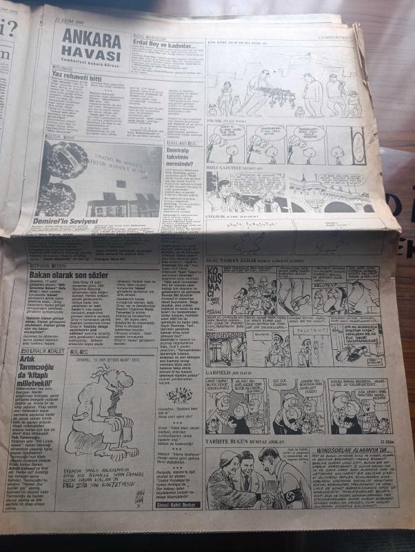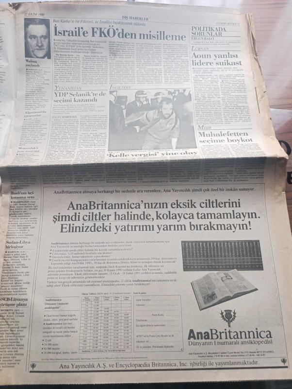 Cumhuriyet Gazetesi - Turkish Newspaper - 22 Ekim 1990 - ANAP'ta zor hafta - İstanbul dün yine 5 yılda bir yaşanan o sayım sessizliğine büründü Fotoğrafı - New York'ta ABD'nin Körfez savaşı'na karşı düzenlenen mitingde Vietnam gazileri de yürüdüler - NATO genel sekreteri Manfred Wörner AKKUM yorumu Türkiye neden veto etsin - Türk İş Genel Başkanı Şevket Yılmaz eylemlerin hedefi iktidar - Asil Nadir iflasını mı isteyecek - tokyo'dan yazan Hasan Cemal - Filistin Kurtuluş Örgütünden misilleme - Hristiyan liderlerden Şamon öldürüldü - Türk Alman ortak yapımı İstanbul'da bir aşk dizisi bu akşam ekrana geliyor - Türkiye Avrupa tekvando şampiyonasında şampiyon oldu - futbolda şike iddiası bantta - makine ve karınca ressamı Mümtaz Yener - bakü'den izlenimler III yazan Oktay Akbal - Ortaoyuncuları Ferhan Şensoy'un soyut padişah oyunu - Başbakan Yıldırım Akbulut İslami terör yok - Atatürkçü düşünce Derneği idamlara karşı imza kampanyası -TKPML'li Ali aktaş'ın kararı infazdan 5 gün sonra verildi, Yunus Nadi tarafından kaleme alınmıştır. Cumhuriyet Gazetesi - Turkish Newspaper - 22 Ekim 1990 - ANAP'ta zor hafta - İstanbul dün yine 5 yılda bir yaşanan o sayım sessizliğine büründü Fotoğrafı - New York'ta ABD'nin Körfez savaşı'na karşı düzenlenen mitingde Vietnam gazileri de yürüdüler - NATO genel sekreteri Manfred Wörner AKKUM yorumu Türkiye neden veto etsin - Türk İş Genel Başkanı Şevket Yılmaz eylemlerin hedefi iktidar - Asil Nadir iflasını mı isteyecek - tokyo'dan yazan Hasan Cemal - Filistin Kurtuluş Örgütünden misilleme - Hristiyan liderlerden Şamon öldürüldü - Türk Alman ortak yapımı İstanbul'da bir aşk dizisi bu akşam ekrana geliyor - Türkiye Avrupa tekvando şampiyonasında şampiyon oldu - futbolda şike iddiası bantta - makine ve karınca ressamı Mümtaz Yener - bakü'den izlenimler III yazan Oktay Akbal - Ortaoyuncuları Ferhan Şensoy'un soyut padişah oyunu - Başbakan Yıldırım Akbulut İslami terör yok - Atatürkçü düşünce Derneği idamlara karşı imza kampanyası -TKPML'li Ali aktaş'ın kararı infazdan 5 gün sonra verildi adlı eser Türkçe dilindedir.