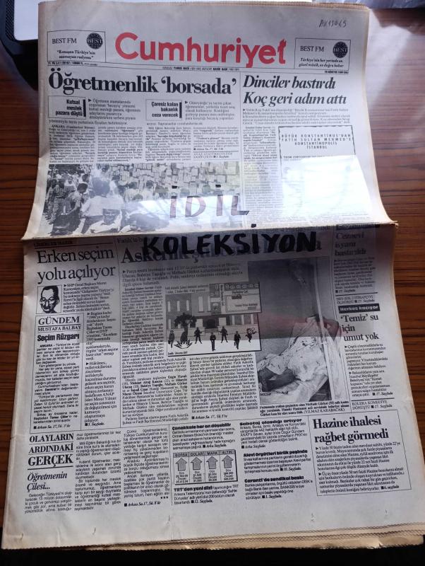 Cumhuriyet Gazetesi - Turkish Newspaper - 23 Ağustos 1994 - öğretmenlik borsada - biniciler bastırdı Koç büyük Konstantinus'tan Fatih Sultan Mehmet'e konulu sempozyumu iptal etti - Erken seçim yolu açılıyor - Dev Sol 3 itirafçıyı öldürdü - Ankara Bursa İzmir Antalya ve Konya'daki yangınlarda sabotaj olasılığı - Garanti bankası'ndan sendikal baskı - Fatih askerlik şubesine bomba 3 ölü 4 yaralı - İmam Hatip için partilerden işbirliği - solun kılavuzu yazan İlhan Selçuk - her yerde Fethullah yazan Hikmet Çetinkaya - Nadir Nadi eşi Berin hanım ve Yaşar Kemal birlikte Fotoğrafı - Diyarbakır valisi Doğan Hatipoğlu'ndan Başbakan Tansu Çillere su uyarısı - Refah Partisi hükümete şartlı destek vaat etti - küba'ya abluka tehdidi - Şeriat ve Alevilik yazan Cemal Şener Miyase İlknur Yazı Dizisi - Şahkulu Sultan Derneği Başkanı Mehmet Ali Yılmazkaya - Fenerbahçe Azerbaycan'ın Turan takımıyla en rahat maçını yapıyor - Galatasaray rakibi Avenir Beggen İzmir'de - Hayrettin için Galatasaray bitti, Yunus Nadi tarafından kaleme alınmıştır. Cumhuriyet Gazetesi - Turkish Newspaper - 23 Ağustos 1994 - öğretmenlik borsada - biniciler bastırdı Koç büyük Konstantinus'tan Fatih Sultan Mehmet'e konulu sempozyumu iptal etti - Erken seçim yolu açılıyor - Dev Sol 3 itirafçıyı öldürdü - Ankara Bursa İzmir Antalya ve Konya'daki yangınlarda sabotaj olasılığı - Garanti bankası'ndan sendikal baskı - Fatih askerlik şubesine bomba 3 ölü 4 yaralı - İmam Hatip için partilerden işbirliği - solun kılavuzu yazan İlhan Selçuk - her yerde Fethullah yazan Hikmet Çetinkaya - Nadir Nadi eşi Berin hanım ve Yaşar Kemal birlikte Fotoğrafı - Diyarbakır valisi Doğan Hatipoğlu'ndan Başbakan Tansu Çillere su uyarısı - Refah Partisi hükümete şartlı destek vaat etti - küba'ya abluka tehdidi - Şeriat ve Alevilik yazan Cemal Şener Miyase İlknur Yazı Dizisi - Şahkulu Sultan Derneği Başkanı Mehmet Ali Yılmazkaya - Fenerbahçe Azerbaycan'ın Turan takımıyla en rahat maçını yapıyor - Galatasaray rakibi Avenir Beggen İzmir'de - Hayrettin için Galatasaray bitti adlı eser Türkçe dilindedir.