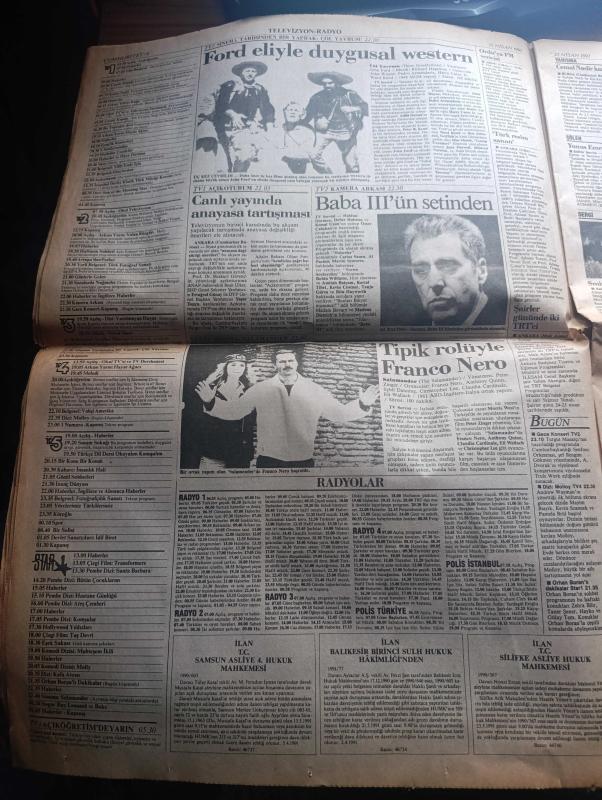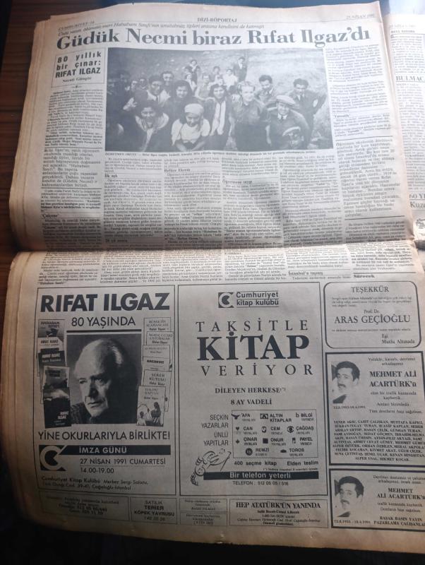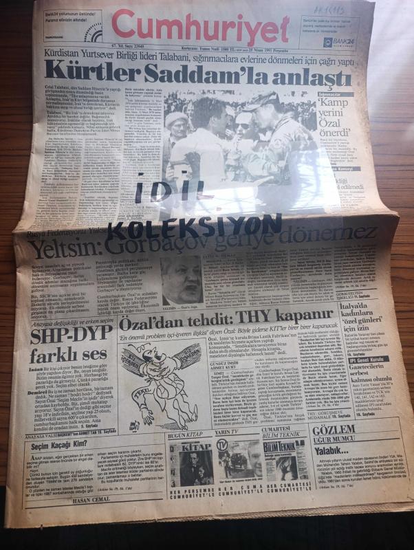Cumhuriyet Gazetesi - Turkish Newspaper - 25 Nisan 1991 - Kürdistan yurtseverler Birliği lideri Talabani sığınmacılara evlerine dönmeleri için çağrı yaptı - Kürtler Saddam'la anlaştı - sığınmacılar için kamp yerini Turgut Özal önerdi - Boris Yeltsin Gorbaçov geriye dönemez - SHP DYP farklı Ses - Turgut Özal'dan tehdit THY Kapanır - Yalabık yazan Uğur Mumcu - Sezarın hakkı yazan İlhan Selçuk - 8. Ankara sanat festivali - Baba 3 filminin setinden Al Pacino Fotoğrafı - Aşiyan müzesine 250 milyonluk makyaj - Orhan Pamuk fotoğraf - Kayahan konseri Hilton'da - Ahmet Arif Rahmi Saltuk İstanbul konseri - Koç holdinge bağlı işyerleri bombalandı - 80 yıllık Çınar Rıfat Ilgaz yazan Necati Güngör Yazı Dizisi - Galatasaray'ın hedefi Avrupa - Mustafa Denizli - Yugoslav teknik direktör Tomislav İviç Fenerbahçe'ye gelebilirim dedi - Eczacıbaşı bayan voleybol takımı antrenörü Cengiz Göllü fotoğraf - Ankaragücü kalecisi Zalad Beşiktaş çok disiplinli dedi Fotoğrafı - Trabzonspor arayış içinde, Yunus Nadi tarafından kaleme alınmıştır. Cumhuriyet Gazetesi - Turkish Newspaper - 25 Nisan 1991 - Kürdistan yurtseverler Birliği lideri Talabani sığınmacılara evlerine dönmeleri için çağrı yaptı - Kürtler Saddam'la anlaştı - sığınmacılar için kamp yerini Turgut Özal önerdi - Boris Yeltsin Gorbaçov geriye dönemez - SHP DYP farklı Ses - Turgut Özal'dan tehdit THY Kapanır - Yalabık yazan Uğur Mumcu - Sezarın hakkı yazan İlhan Selçuk - 8. Ankara sanat festivali - Baba 3 filminin setinden Al Pacino Fotoğrafı - Aşiyan müzesine 250 milyonluk makyaj - Orhan Pamuk fotoğraf - Kayahan konseri Hilton'da - Ahmet Arif Rahmi Saltuk İstanbul konseri - Koç holdinge bağlı işyerleri bombalandı - 80 yıllık Çınar Rıfat Ilgaz yazan Necati Güngör Yazı Dizisi - Galatasaray'ın hedefi Avrupa - Mustafa Denizli - Yugoslav teknik direktör Tomislav İviç Fenerbahçe'ye gelebilirim dedi - Eczacıbaşı bayan voleybol takımı antrenörü Cengiz Göllü fotoğraf - Ankaragücü kalecisi Zalad Beşiktaş çok disiplinli dedi Fotoğrafı - Trabzonspor arayış içinde adlı eser Türkçe dilindedir.