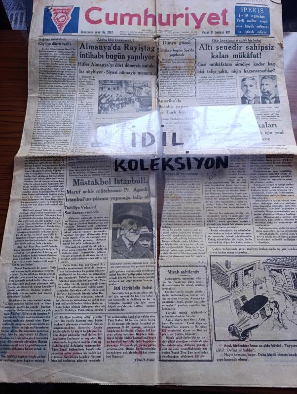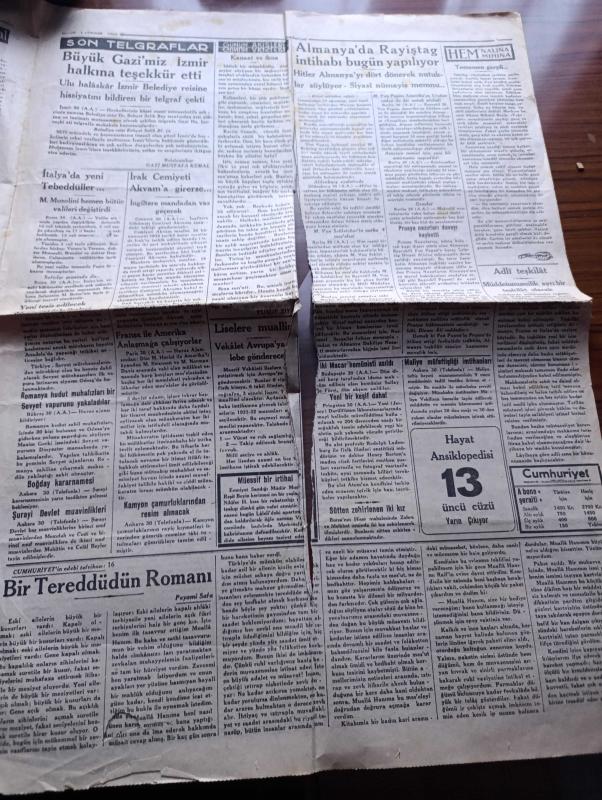 Cumhuriyet Gazetesi - Turkish Newspaper - 31 Temmuz 1932 - buğday müstahsili köylüye düşen vazife yazan Yunus Nadi - Almanya'da Rayiştag intihabı bugün yapılıyor - Hitler Almanya'yı dört dönerek nutuklar söylüyor fotoğraf - Amerika'da hocalık yapan bir Türk kızı Muhittin Hanım fotoğraf - maruf şehir mütehassısı Pr. Agach da İstanbul'un planını yapmaya talip oldu - Gazi köprüsü ihalesi - Gazi mükafatına şimdiye kadar talip olanlardan Şeref Bey ve Abdullah Cevdet bey fotoğraf - gizli harp Alman ve Fransız casusları arasında muharriri binbaşı Ladoux Yazı Dizisi - tarihten sonraki devrin ilk büyük Türk kahramanı Mete kimdir - Bir tereddütün romanı yazan Peyami Safa Yazı Dizisi - Büyük Gazimiz Mustafa Kemal İzmir halkına teşekkür etti - Mussolini bütün valileri değiştirdi - İki Macar komünisti asıldı - tayyareciliğin ilk kahramanlarından Santos Dumont öldü - fındıklarımız aleyhinde Avrupa'da şedit propaganda yapılıyor - Almanya'da bütün dünyanın alaka ile beklediği seçim Hitler kazanacak mı adlı eser, Kitap > Süreli Yayınlar > Gazeteler > Türkiye > Genel > Günlük kategorisinde İkinci El olarak satıştadır.