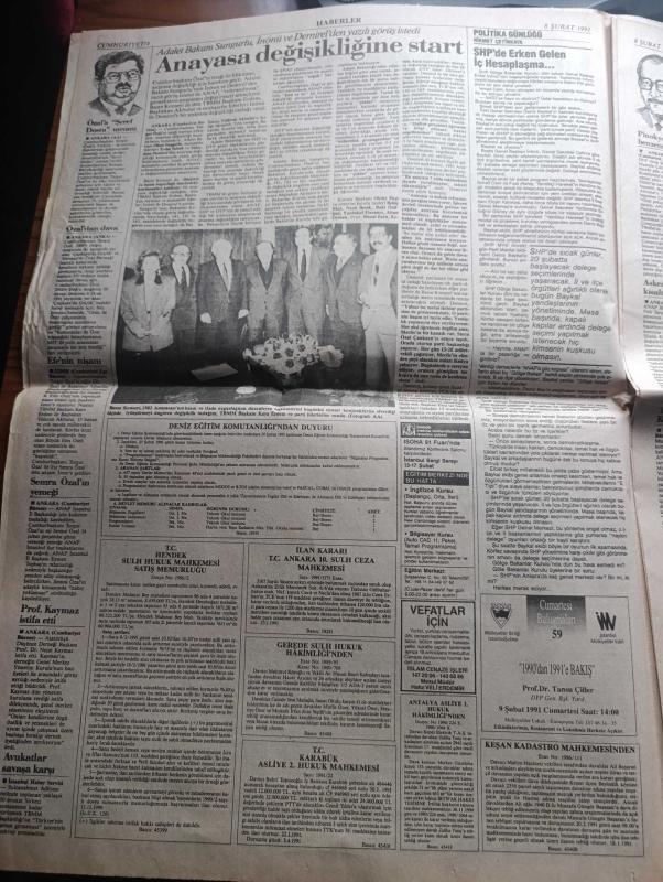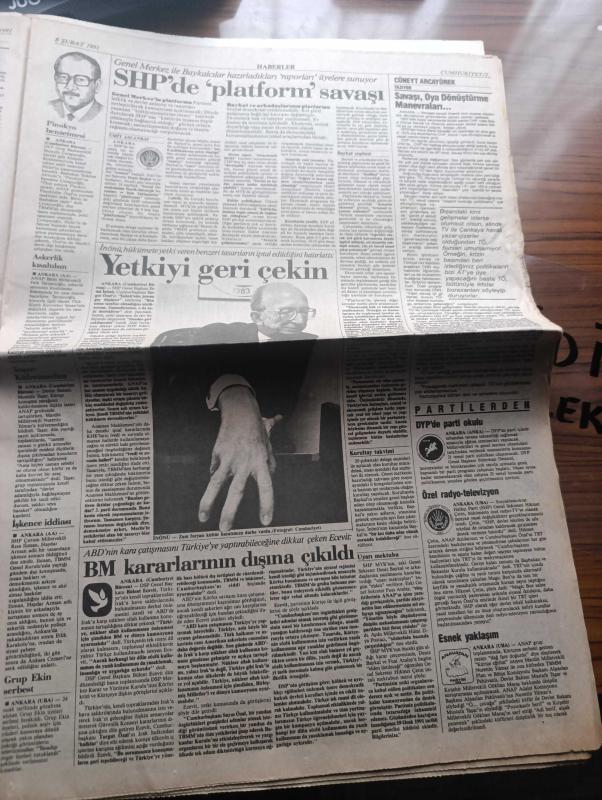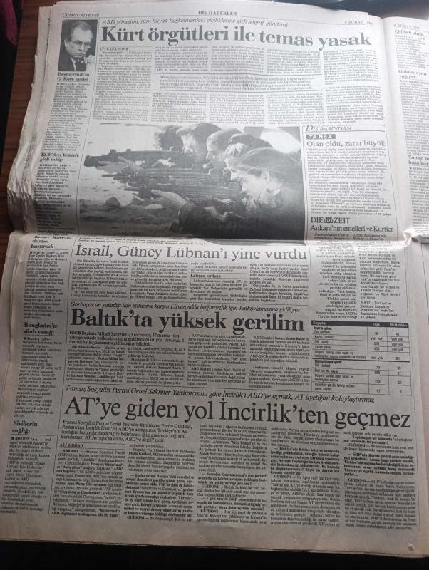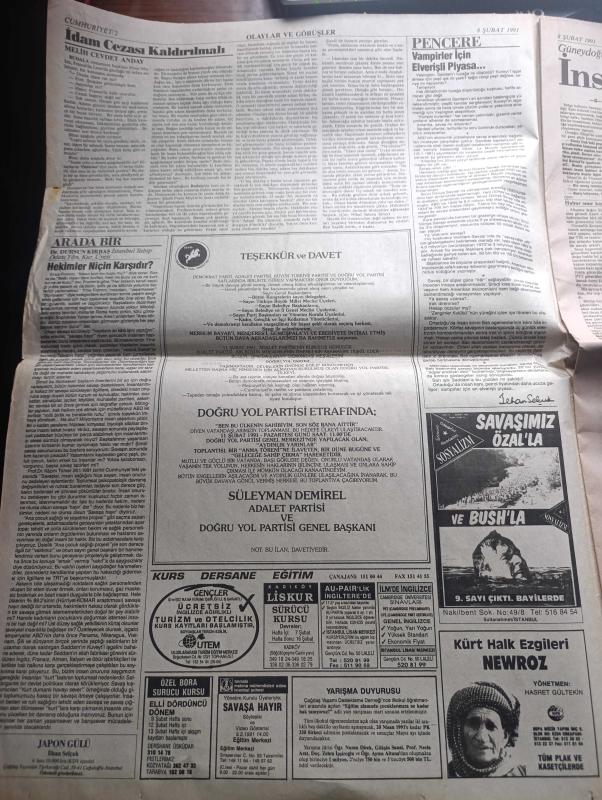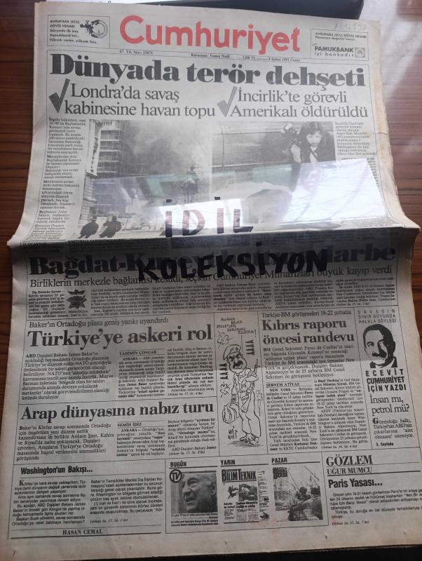 Cumhuriyet Gazetesi - Turkish Newspaper - 8 Şubat 1991 - dünyada terör dehşeti - Londra'da Savaş kabinesine havan topu - incirlik'te görevli Amerikalı öldürüldü - Bağdat Kuveyt hattına darbe - ABD Dışişleri Bakanı James Baker'ın Orta Doğu planı geniş yankı uyandırdı - Kıbrıs raporu öncesi randevu - Amerikalı'ya saldırıyı Dev Sol üstlendi - Paris yasası yazan Uğur Mumcu - Washingtonun bakışı yazan Hasan Cemal - Bülent Ecevit Cumhuriyet için yazdı İnsan mı Petrol mü - idam cezası kaldırılmalı yazan Melih Cevdet Anday - Turgut Özal'a Şeref dostu ünvanı - Haydar Arman adlı vatandaşın işkence sonucu öldürüldüğü ileri sürüldü - SHP'de platform savaşı - DYP'de Parti Okulu - Stephen King'in yapıtından sinema aktarılan Misery sinemalarda Fotoğrafı - Hakkari devlet hastanesinin arka bahçesinde Sahra hastanesi böyle kuruldu fotoğraf - İstanbul belediyesi şehir tiyatroları - ABD yönetimi Kürt örgütleri ile temas yasak - Kuveyt harekatı savaş haritası - Fenerbahçe otelden kurtuluyor - Milan, Yunus Nadi tarafından kaleme alınmıştır. Cumhuriyet Gazetesi - Turkish Newspaper - 8 Şubat 1991 - dünyada terör dehşeti - Londra'da Savaş kabinesine havan topu - incirlik'te görevli Amerikalı öldürüldü - Bağdat Kuveyt hattına darbe - ABD Dışişleri Bakanı James Baker'ın Orta Doğu planı geniş yankı uyandırdı - Kıbrıs raporu öncesi randevu - Amerikalı'ya saldırıyı Dev Sol üstlendi - Paris yasası yazan Uğur Mumcu - Washingtonun bakışı yazan Hasan Cemal - Bülent Ecevit Cumhuriyet için yazdı İnsan mı Petrol mü - idam cezası kaldırılmalı yazan Melih Cevdet Anday - Turgut Özal'a Şeref dostu ünvanı - Haydar Arman adlı vatandaşın işkence sonucu öldürüldüğü ileri sürüldü - SHP'de platform savaşı - DYP'de Parti Okulu - Stephen King'in yapıtından sinema aktarılan Misery sinemalarda Fotoğrafı - Hakkari devlet hastanesinin arka bahçesinde Sahra hastanesi böyle kuruldu fotoğraf - İstanbul belediyesi şehir tiyatroları - ABD yönetimi Kürt örgütleri ile temas yasak - Kuveyt harekatı savaş haritası - Fenerbahçe otelden kurtuluyor - Milan adlı eser Türkçe dilindedir.