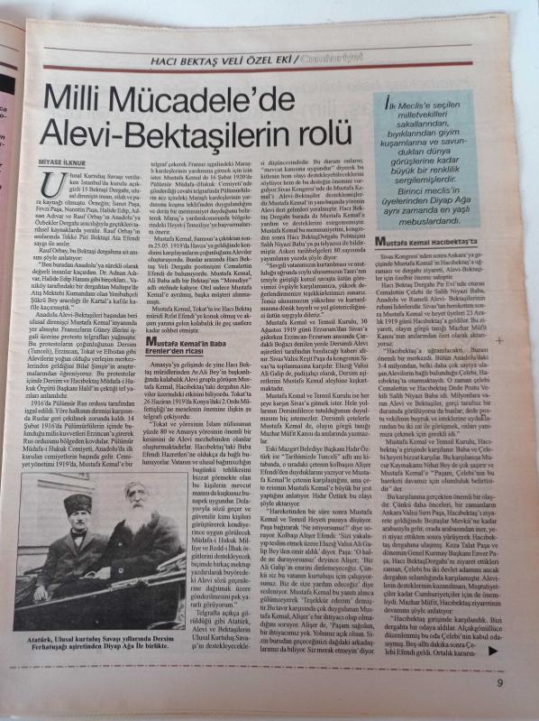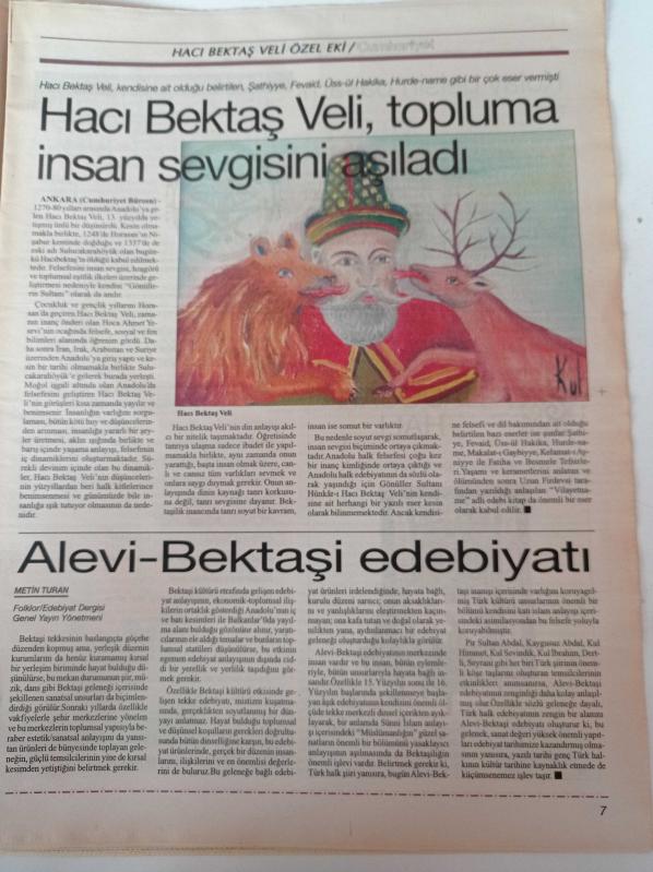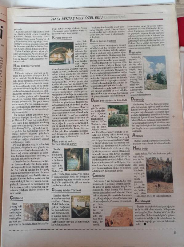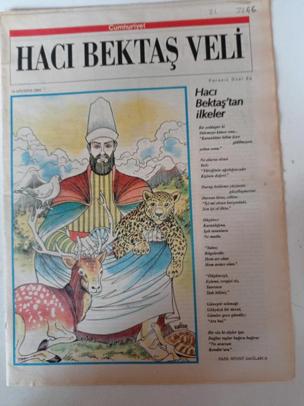 Cumhuriyet Hacı Bektaş Veli Gazetesi - 16 Ağustos 2004 - Fazıl Hüsnü Dağlarca- Benim Kabem İnsandır - Uygarlığın Beşiği Pir Müzesi - Mihman Evi - Çilehane - Milli Mücadelede Alevi Bektaşilerin Rolü adlı eser Türkçe dilindedir.