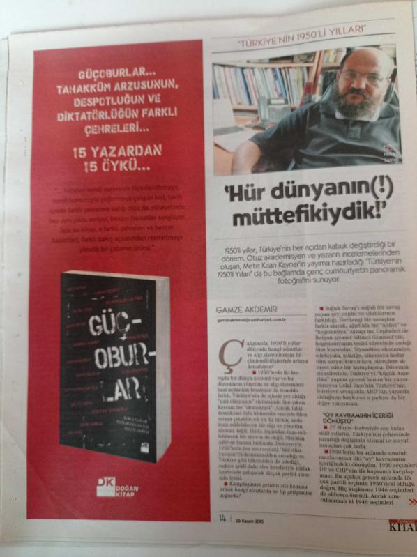 Cumhuriyet Kitap - 26 Kasım 2015 - Sayı 1345 - Pelin Batu Ve Neslihan Önderoğlu Fotoğrafı - Filmi Geriye Sarınca - Mete Kaan Kaynar - Kemal Anadol -Hayatı Saran Öyküler - Erk Şiddeti - Sezdirme Yeteneği -Enver Aysever - Yaralısın Türkiye- Yazgıcılar- William S. Burroughs - Tom Sawyer'in Kitap Okuduğu Kulübe - Türkiye'nin 1950'li Yılları adlı eser Türkçe dilindedir.