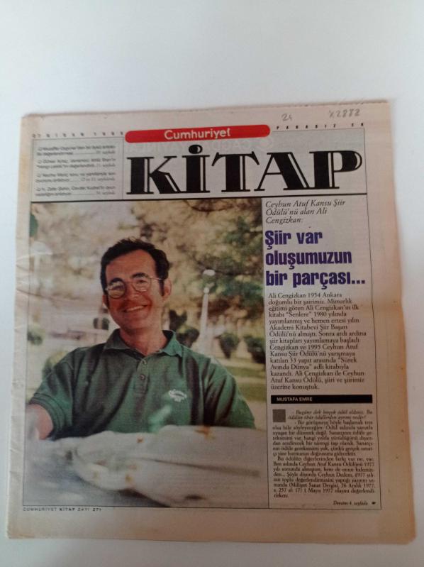 Cumhuriyet Kitap - 27 Nisan 1995 - Sayı 271 - Ali Cengizkan Fotoğrafı - Ceyhun Atuf Kansu Şiir Ödülünü Alan Ali Cengizkan- Sistem Karşıtı Hareketler- Borges - Kum Kitabı - Hopkins-Şiir Var Oluşumuzun Bir Parçası - Attila İlhan - Cevdet Kudret adlı eser Türkçe dilindedir.