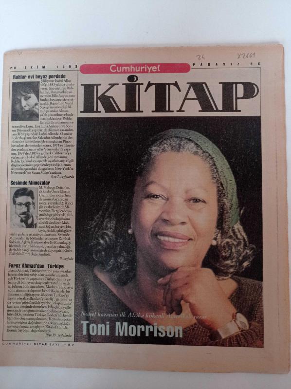 Cumhuriyet Kitap - 28 Ekim 1993 - Sayı 192 - Toni Morrison Fotoğrafı - Şiirle Kurulan Köprüler - Trayan Petrovski- Stephen Hawking -Nobel Kazanan İlk Afrika Kökenli Amerikalı Yazar Toni Morrison- Ruhlar Evi Beyaz Perdede - Sesimde Mimozalar - Feroz Ahmad'dan Türkiye - Bilim Adamı adlı eser Türkçe dilindedir.