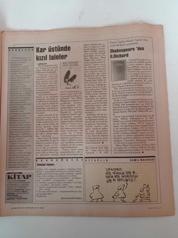 Sayfa Boyutu: 28*31cm Sayfa Sayısı:16 Cumhuriyet Kitap Gazetesi Yıpranma, sararmalar, kupon kesiği ve yırtılmalar zamana bağlı olarak görülebilir