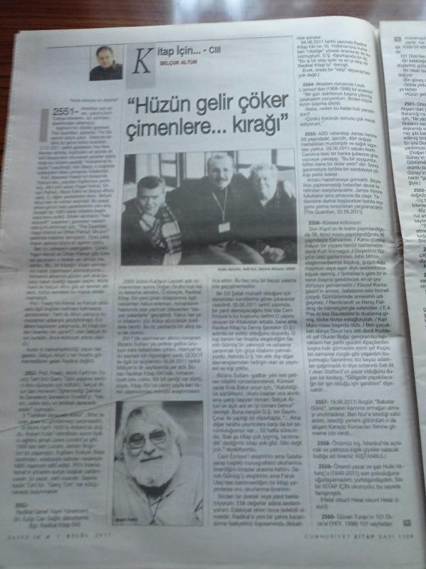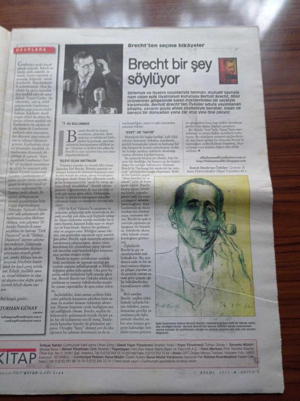 Cumhuriyet Kitap Gazetesi - 1 Eylül 2011 - Turgut Çeviker Karikatürkiye - Bertolt Brecht Bir Şey Söylüyor - Mehmet Akif Tutumlu'dan Hüzünlü Öğretiler Felsefî Aforizmalar - Levent Çalıkoğlu'ndan Sanatçılar Üzerine Metinler - Leyla Erbil'den Tuhaf Bir Kadın - Charles Dickens Hafiyeleri İş Başında adlı eser Türkçe dilindedir.
