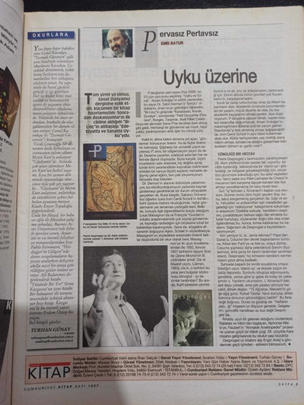 Cumhuriyet Kitap Gazetesi- 22 Ekim 2009- Enis Batur- Cemil Kavukçu- Celal Üster- Cahit Kayra- Metin Celal- Cahide Birgül- Vecdi Çıracıoğlu- Sema Kaygusuz- Yıpranma, Sararma, Yırtılmalar Zamana Bağlı Olarak Görülebilir.