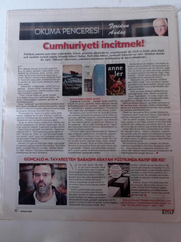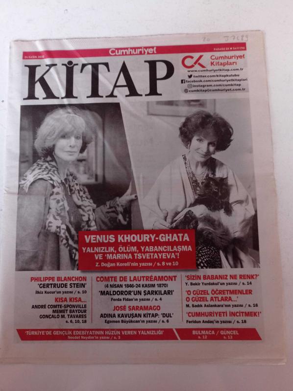 Cumhuriyet Kitap Gazetesi - 24 Kasım 2022 - Venüs Khoury Ghata Fotoğrafı - Yalnızlık Ölüm Yabancılaşma Ve Marina Tsvetayeva- Jose Saramago - Philippe Blanchon - Sizin Babanız Ne Renk - Adına Kavuşan Kitap Dul- Andre Comte Sponville adlı eser Türkçe dilindedir.