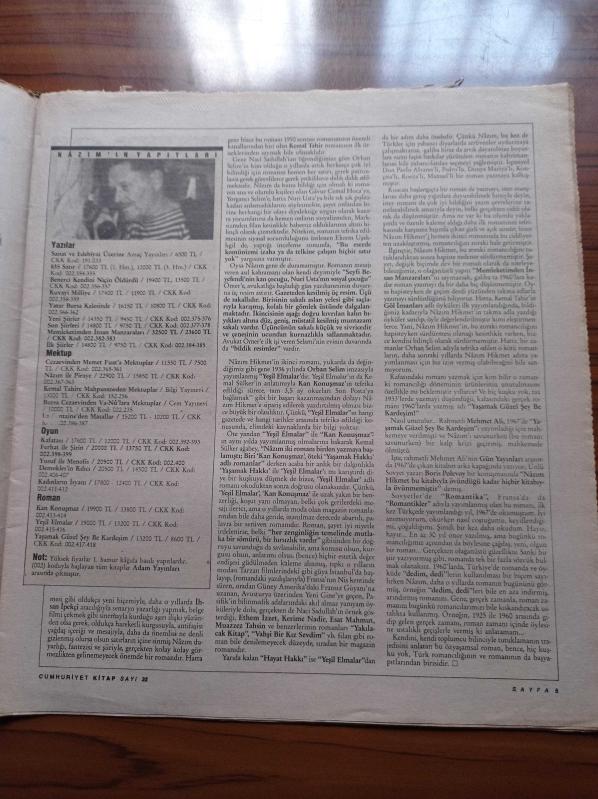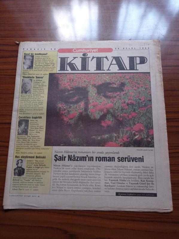 Cumhuriyet Kitap Gazetesi - 28 Eylül 1990- Sayı 32 - Cılız Beden Altında Gladyatör Portre Belinski - Nikolay Gogol - Türkiye İş Bankası Kültür ve Sanat Dergisi -Nazım Hikmet Fotoğrafı - Gömleğimin Yakası Kirli - Kerim Korcan - Hayatı Değiştirmek Şimdi - Latin Amerika'nın Atar Damarları - François Mitterand adlı eser Türkçe dilindedir.