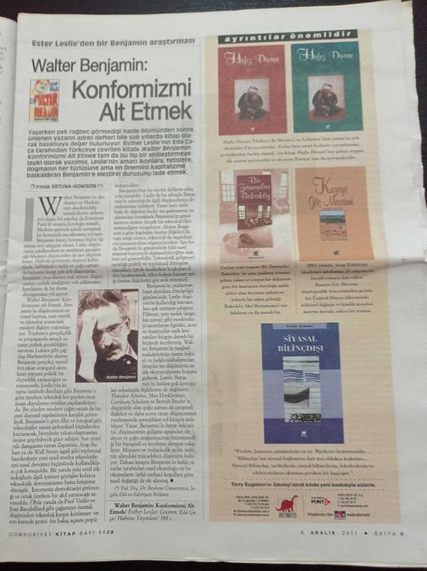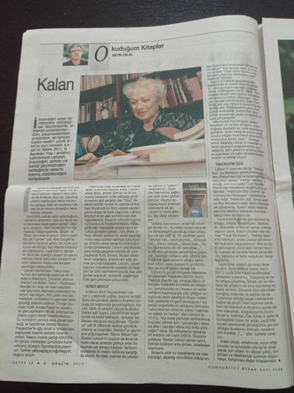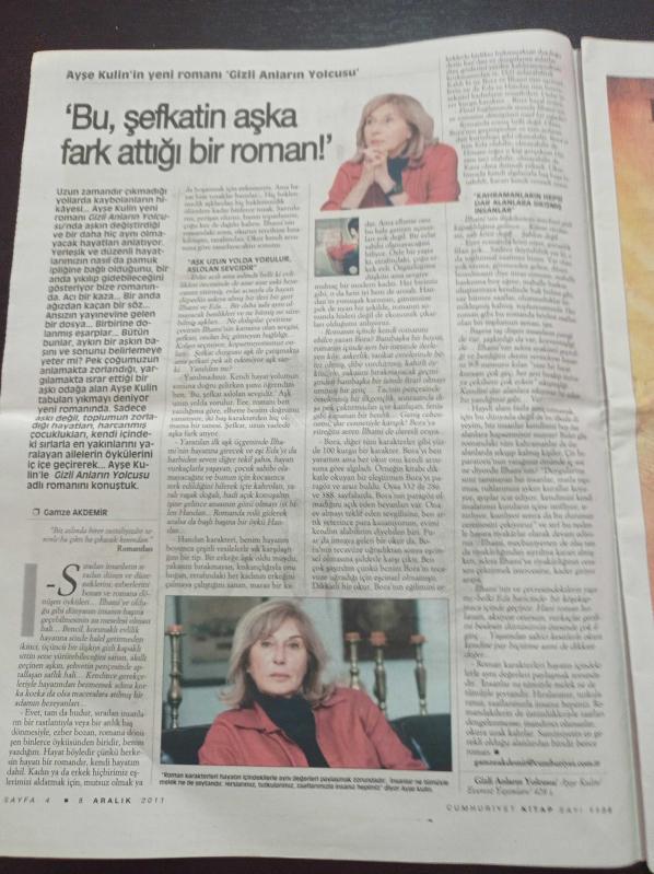 Cumhuriyet Kitap Gazetesi - 8 Aralık 2011- Sayı 1138- Ayşe Kulin Gizli Anların Yolcusu - Hasan Özkılıç -Lataros Değirmeninde Üç Dakika - Erendiz Atasü Güneş Saygılı'nın Gerçek Yaşamı adlı eser Türkçe dilindedir.
