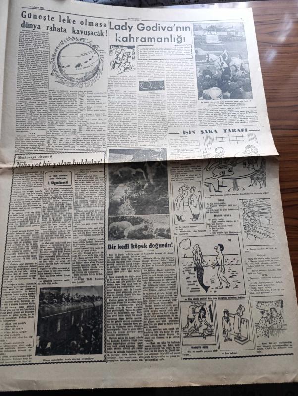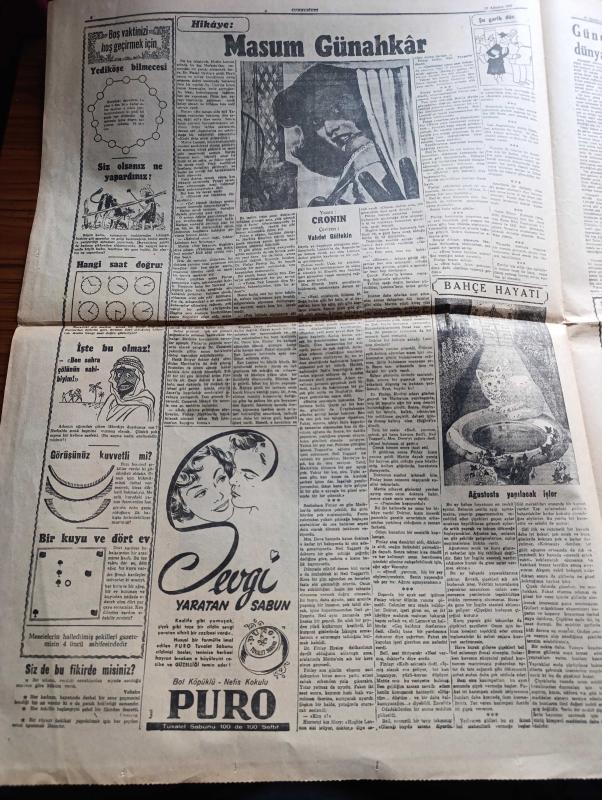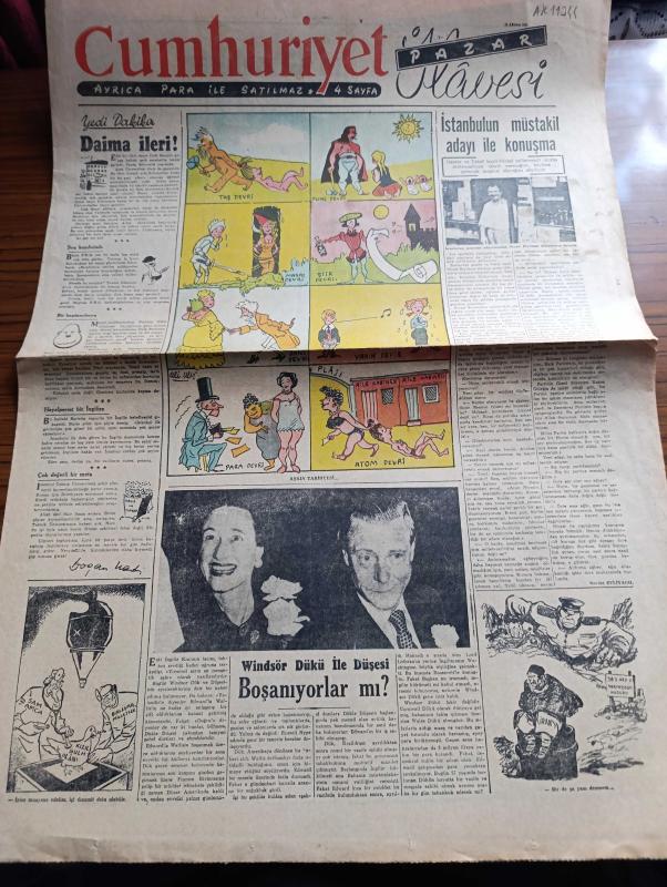 Cumhuriyet Pazar Gazetesi - 12 Ağustos 1951 - Yedi Dakika Yazan Doğan Nadi - renkli karikatür Aşkın tarihçesi - İstanbul'un müstakil adayı Niyazi Eryılmaz ile konuşma yazan Necdet Evliyagil - Windsor Dükü ile Düşesi boşanıyorlar mı fotoğraf - boş vaktinizi hoş geçirmek için - hikaye mahsun günahkar yazan Cronin - Puro Tuvalet sabunu - güneşte leke olmasa dünya rahata kavuşacak - Moskova'ya davet 6 yazan Leh milli Demokrat Partisi liderlerinden Z. Stypulkovski - bir kedi köpek doğurdu - Lady Godiva'nın kahramanlığı - İşin şaka tarafı köşesi - manalı bakış kraliçesi Villi Palmer Fotoğrafı - Pier Angeli meşhur İngiliz artisti Stewart Granger ile son filminde fotoğraf - Sezer Sezin'le Kenan Artun Tahirle Zühre filminde fotoğraf - Sezer Sezinle Erman Kardeşler arasında ihtilaf çıktı - hollywood'dan ne haber - İster inan ister inanma çizen Ripley - paris'teki ağaç lokantalar - 40 kilo ağırlığında bir patates - imparatoriçe Marie Louise - K.B.K kumaş mağazası - Ağustosta yapılacak işler adlı eser, Kitap > Süreli Yayınlar > Gazeteler > Türkiye > Genel > Günlük kategorisinde İkinci El olarak satıştadır.