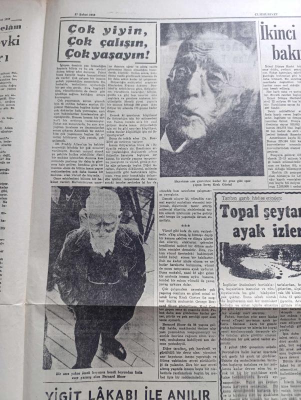 Cumhuriyet Pazar Gazetesi - 17 Şubat 1952 - Dünya Olayları - İsrail'in 33 Yaşındaki Alaydan Yetişme Genelkurmay Başkanı Yigael Yadin - Renkli Karikatür - Haftanın Şakaları Yazan Burhan Felek - Rusya'nın Gizli Cebeluttarık Boğazı - Yarenlik Yazan Elif Naci - Hikaye Üç Portakal Yazan Ve Resimleyen Zahir Güvemli - Boş Vaktinizi Hoş Geçirmek İçin Eğlence Köşesi - Memleketten Selam Yazan Yaşar Kemal - Kendi Boyundan Eser Yazmış Olan Bernard Shaw Fotoğrafı - Hayatının Son Günlerine Kadar Genç Gibi Spor Yapan İsveç Kralı Güstaf Fotoğraf - İkinci Dünya Harbi Can Ve Para Bakımından Neye Maloldu - Cumhuriyet Hollywood'da Yazan Haluk Durukal - Esther Williams Ve Alan Ladd Birinci Fotoğrafı - Greta Garbo İlahi Kadın Filminde Fotoğraf - Çakırcalı'nın Definesi Filminde Belgin Doruk Ve Mahir Özerden Fotoğraf - İster İnan İster İnanma Çizen Ripley, Yunus Nadi tarafından kaleme alınmıştır. Cumhuriyet Pazar Gazetesi - 17 Şubat 1952 - Dünya Olayları - İsrail'in 33 Yaşındaki Alaydan Yetişme Genelkurmay Başkanı Yigael Yadin - Renkli Karikatür - Haftanın Şakaları Yazan Burhan Felek - Rusya'nın Gizli Cebeluttarık Boğazı - Yarenlik Yazan Elif Naci - Hikaye Üç Portakal Yazan Ve Resimleyen Zahir Güvemli - Boş Vaktinizi Hoş Geçirmek İçin Eğlence Köşesi - Memleketten Selam Yazan Yaşar Kemal - Kendi Boyundan Eser Yazmış Olan Bernard Shaw Fotoğrafı - Hayatının Son Günlerine Kadar Genç Gibi Spor Yapan İsveç Kralı Güstaf Fotoğraf - İkinci Dünya Harbi Can Ve Para Bakımından Neye Maloldu - Cumhuriyet Hollywood'da Yazan Haluk Durukal - Esther Williams Ve Alan Ladd Birinci Fotoğrafı - Greta Garbo İlahi Kadın Filminde Fotoğraf - Çakırcalı'nın Definesi Filminde Belgin Doruk Ve Mahir Özerden Fotoğraf - İster İnan İster İnanma Çizen Ripley adlı eser Türkçe dilindedir.