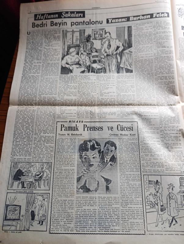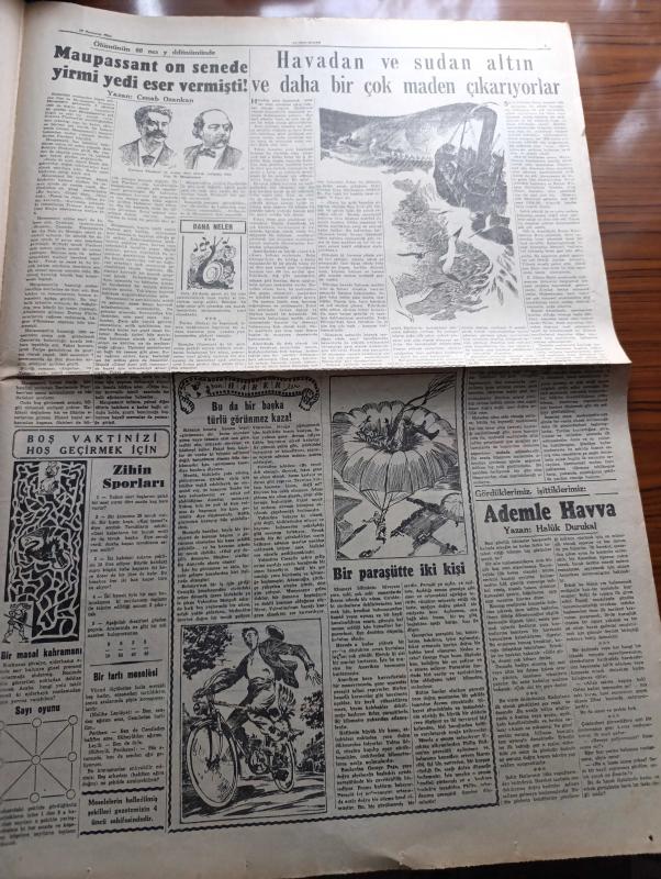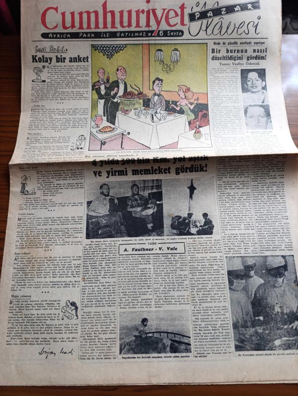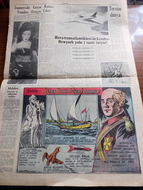 Cumhuriyet Pazar Gazetesi - 19 Temmuz 1953 - Yedi Dakika Yazan Doğan Nadi - renkli karikatür - bir burnun nasıl düzeltildiğini gördüm yazan Vasfiye Özkoçak - Beş parasız dünya seyahati yazan A. Faulkner V. Vale - haftanın şakaları yazan Burhan Felek - hikaye Pamuk Prenses ve cücesi Yazan M. Reinhardt - beyazperde kahramanlarını dile getirenler Hayri Esen fotoğraf - Rita Hayworth şimdi de Üç boyutlu bir film çeviriyor fotoğraf - Avrupa film dünyasının en parlak yıldızı Silvana Mangano Yazan Feyyaz Tokar - Gregory Peck Kilimancaro filminde Ava Gardner'le beraber fotoğraf - Ev Kadın Moda köşesi - ölümünün 60. yıldönümünde Maupassant On Senede Yirmi Yedi Eser Vermişti Yazan Cenab Ozankan - boş vaktinizi hoş geçirmek için - Ademle Havva yazan Haluk Durukal - Japonya'da Geyşa kızları yeniden ortaya çıktı fotoğraf - Hava transatlantikleri ile Londra New York yolu 7 saate iniyor - İster İnan İster İnan İnanma Çizen Ripley - Gözsüz balık - Mississippi nehrinde ilk gemi adlı eser, Kitap > Süreli Yayınlar > Gazeteler > Türkiye > Genel > Günlük kategorisinde İkinci El olarak satıştadır.