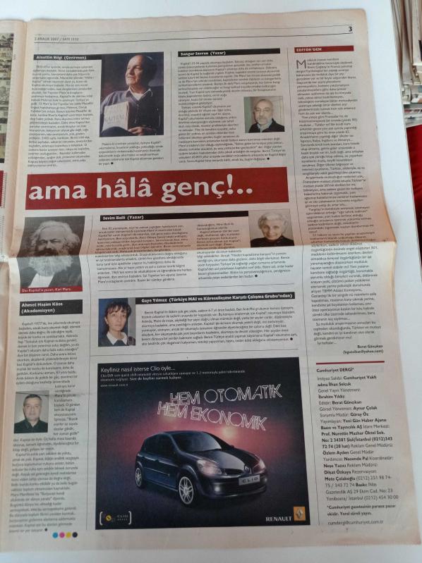 Cumhuriyet Pazar Gazetesi - 2 Aralık 2007 - Sayı 1132-tam sayfa cola turka reklamı- Abidin Dino ve Güzin Dino Fotoğrafı - Das Kapital 140 Yaşında - Karl Marx - Sevim Belli - Sungur Savran adlı eser Türkçe dilindedir.