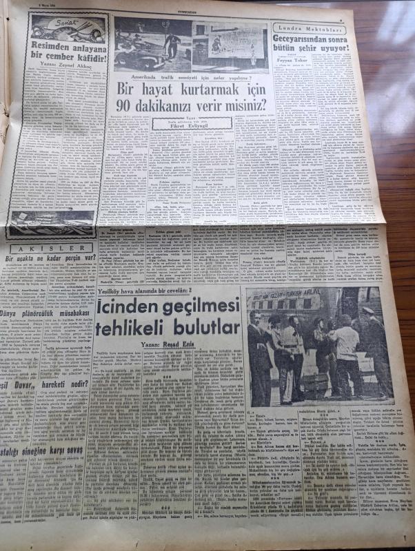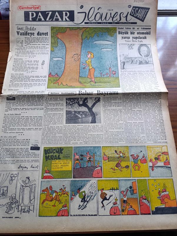 Cumhuriyet Pazar Gazetesi - 2 Mayıs 1954 - Yedi Dakika Yazan Doğan Nadi Köşe Yazısı - Haftanın Ansiklopedisi Bahar Bayramı - Küçük Kral Karikatür - İstanbul Fethinin 501. Yıldönümünde Büyük Bir Otomobil Yarışı Yapılacak Yazan Metin Ergin - Haftanın Şakaları Aşk Mektubu Yazan Burhan Felek - Dansöz Nana Kendi Hesabına Bir Film Çeviriyor Çılgın Bakire - Yirmialtı Yılın Yirmialtı Oscar'ı - Bu Dünyadan Ebediyete Filminde Audrey Hepburn - Susan Hayward'ı Kocası Gölde Boğmaya Kalkmış - Ünlüleri Gözlerinden Ve Ağızlarından Tanıyabilir Misiniz - Yılın En Başarılı Filmi Çekiliyor - Ev Kadın Moda - Yeşil Duvar Hareketi Nedir - Dünya Planörcülük Müsabakası - Londra Mektubu Yazan Feyyaz Tokar - İleride Kendisinden Bahsettirecek Çocuk Birol Meto - İster İnan İster İnanma Köşesi - İlk Kovboylar Mısırlılardı - Planlı Şehir Kurmanın Da Mektebi Var - Tepkili Uçaklarla Türbin Pervaneli Uçağın Farkları - Gene Tierney Ali Hanın Yüzüğünü Sol Eline Geçirdi - Bir Hayat Kurtarmak İçin 90 Dakikanı Verir Misin adlı eser, Kitap > Süreli Yayınlar > Gazeteler > Türkiye > Genel > Günlük kategorisinde İkinci El olarak satıştadır.