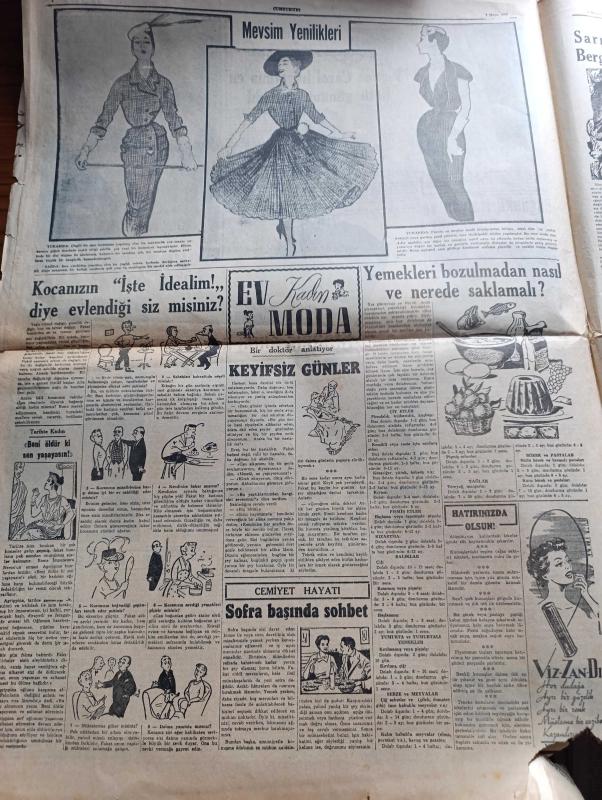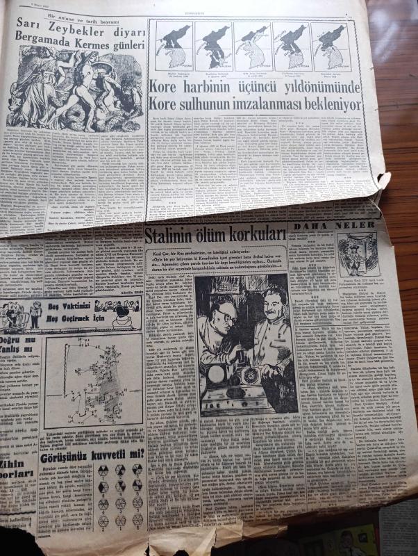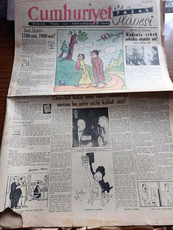 Cumhuriyet Pazar Gazetesi - 3 Mayıs 1953 - Yedi dakika yazan Doğan Nadi - Bahar Teraneleri renkli karikatür - meraklı bir münakaşa kadınlarla erkek arkadaş olabilir mi yazan Kazım Kip - Churchill 8 sene önce reddettiği unvanı bu sefer ne için kabul etti fotoğraf - hikaye yeşil soğan yazan Yaşar Kemal - haftanın şakaları yazan Burhan Felek - Fransız yıldızı Martine Carol hayatının en kötü gününü kutladı fotoğraf - bugünkü İtalyan ve Alman filmciliği - beyaz perdenin fena adamları - romantik aşk rollerini seven İngiliz yıldızı Muriel Pavlow fotoğraf - ev kadın moda sayfası - sarı zeybekler diyarı Bergama'da kermes günleri - Kore Harbinin üçüncü yıldönümünde kore sulhunun imzalanması bekleniyor - boş vaktinizi hoş geçirmek için - Stalin'in ölüm korkuları - bir güzellik müsabakası ve beklenmedik bir son - Churchill'den sonra Eisenhower de yağlı boya resim yapmaya başladı fotoğraf - fotoğraf güzeli ikincilik ve üçüncülük alanların ortasında fotoğraf - Hintli rakkase yılanla dans ederken adlı eser, Kitap > Süreli Yayınlar > Gazeteler > Türkiye > Genel > Günlük kategorisinde İkinci El olarak satıştadır.