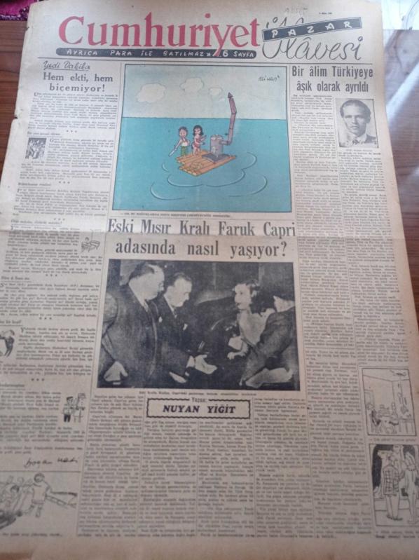Cumhuriyet Pazar Gazetesi - 5 Ekim 1952 - Eski Mısır Kralı Faruk Capri Adasında Nasıl Yaşıyor - Profesör Armas Salonen Bir Alim Olarak Türkiye'ye Aşık Olarak Ayrıldı - Nuyan Yiğit - Haftanın Şakaları Yazan Burhan Felek - Bizim Yıldızlar Gül Güney - Sinema En Güzel Türk Filmleri Seçilecek - Efelerin Efesi Yakında Gösteriliyor - Katherine Hepburn- Can Yoldaşı Filmi - Cahid Irgad - Zarah Leander Tekrar Perdede - Fox Stüdyosunda Masa Üzerindeki Rakı Şişesi - Danielle Delorme - Ursula Thiess - Hikaye Ölüm Karşısında - Kadın Ev Moda - Zehirli Gazlara Çare Aranırken Yeni Bir İlaç Bulundu - Feyyaz Tokar - Ses Duvarı Denen Şey Nedir - Dodge Otomobillerinin Fabrikatörü Evlenmek İstediği Kızı Alamadı - Gregg Sherwood - Ernest Jones Adında Bir İngiliz Golf Şampiyonu - Çöpçatanlık Eden Şapka adlı eser, Kitap > Süreli Yayınlar > Gazeteler > Türkiye > Genel > Günlük kategorisinde İkinci El olarak satıştadır.