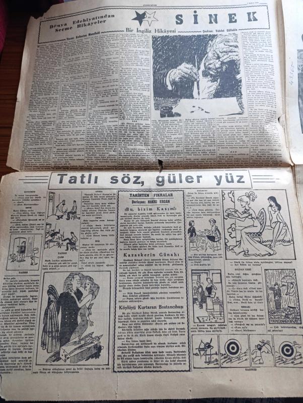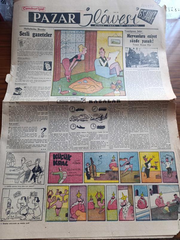 Cumhuriyet Pazar Gazetesi - 7 Şubat 1954 - hadiselerden ilhamlar sesli gazeteler - yaşadığımız şehir hayvanları eziyet sözde yasak yazan Kazım Kip - renkli karikatür - haftanın ansiklopedisi kazalar - küçük Kral çizen O. Soglow - dünya edebiyatından seçme hikayeler sinek yazan Katherine Mansfield - tarihten fıkralar derleyen Hakkı Ercan - Elizabeth Taylor yorgun düştü fotoğraf - Orson Welles boğa ile Charlie Chaplin ayı ile boğuştular fotoğraf - Gina Lollobrigida büyük oyunda fotoğraf - yeni Türk filmlerinden sahneler - Safiye Sultan filminde Cahit Irgat Atıf kaptan Feridun Çölgeçen Hulusi kentmen fotoğraf - bu kadın benimdir filminden bir fotoğraf - yağmur ve Rita Hayworth fotoğraf - Ev Kadın Moda - Tarihe Malolmuş Kadınlar Yazan Mustafa Baydar - Japonya'nın belini kıran leyte savaşında Samar muharebesi - evlenip boşanma şampiyonları nihayet birbirlerini buldular - Barbara Hutton İkinci kocası Danimarkalı Kont Reventlow ile fotoğraf - 1954 Fransız güzeli İrene Trune fotoğraf adlı eser, Kitap > Süreli Yayınlar > Gazeteler > Türkiye > Genel > Günlük kategorisinde İkinci El olarak satıştadır.