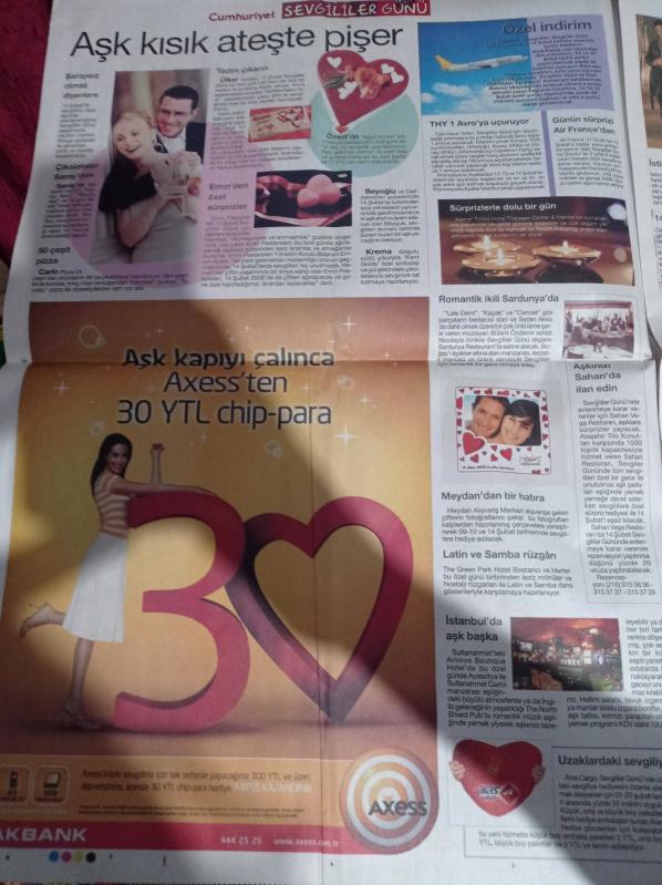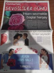 Cumhuriyet Sevgililer Günü Gazetesi - 9 Şubat 2008 - Aşk Tazelemek İçin Romantik Filmleri Seyredin - Doktor Jivago - Melekler Şehri - Sil Baştan - Giysinizi Burcunuza Göre Seçin - Türk Hava Yolları 1 Euro'ya Uçuyor - Tekno Aşklar İçin - Sevgiliye Özel Hediyeler - Valentinus Ve Hikayesi- Bir Şiir Yeter - Ben Sana Mecburum Şiiri - Attila İlhan - Aşkın Taşı Pırlanta adlı eser Türkçe dilindedir.